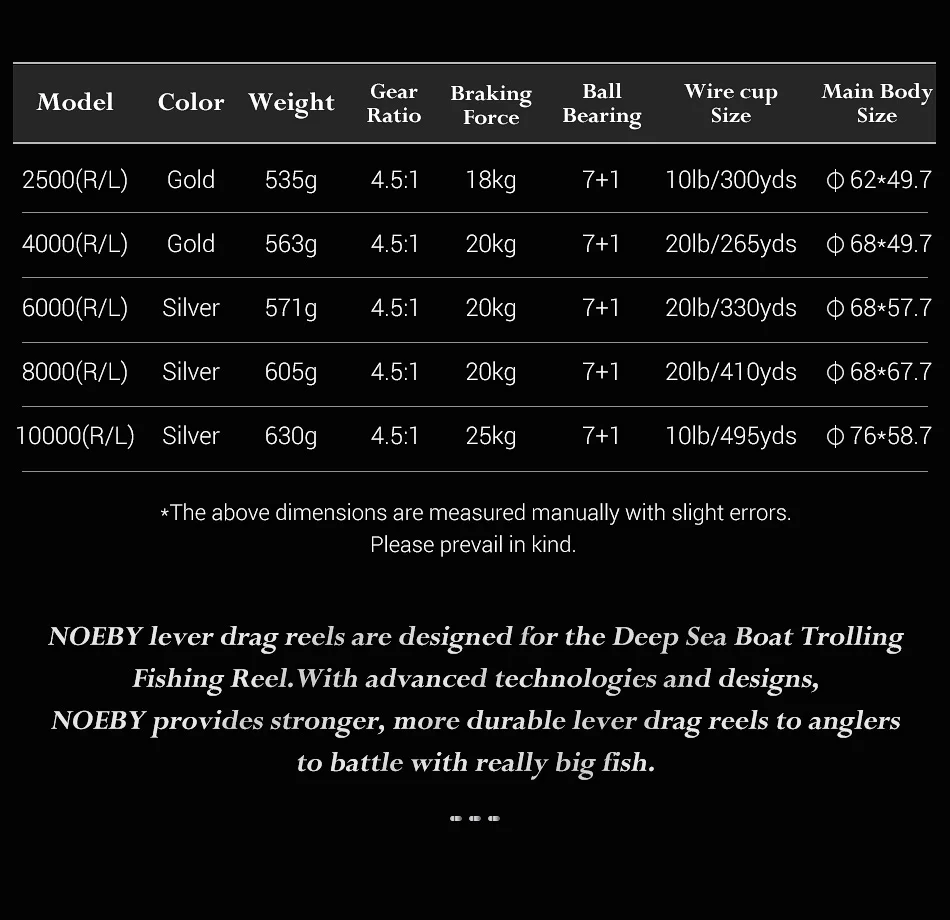 NOEBY lever drag reels are designed for the Deep Sea Boat Trolling Fishing Reel.With advanced technologies and designs, NOEBY provides stronger, more durable lever drag reels to anglers to battle with really big fish.
