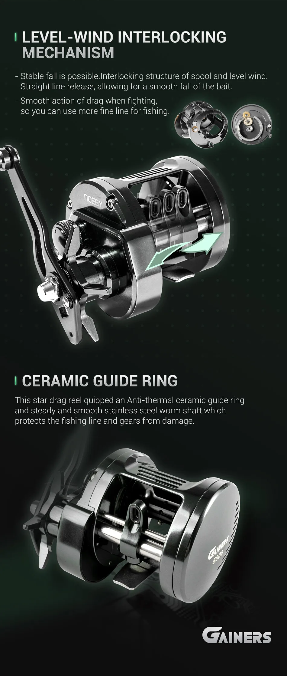 Este carrete de arrastre en forma de estrella tiene un anillo guía de cerámica antitérmica y un eje de gusano de acero inoxidable estable y suave que protege el hilo de pescar y los engranajes contra daños.