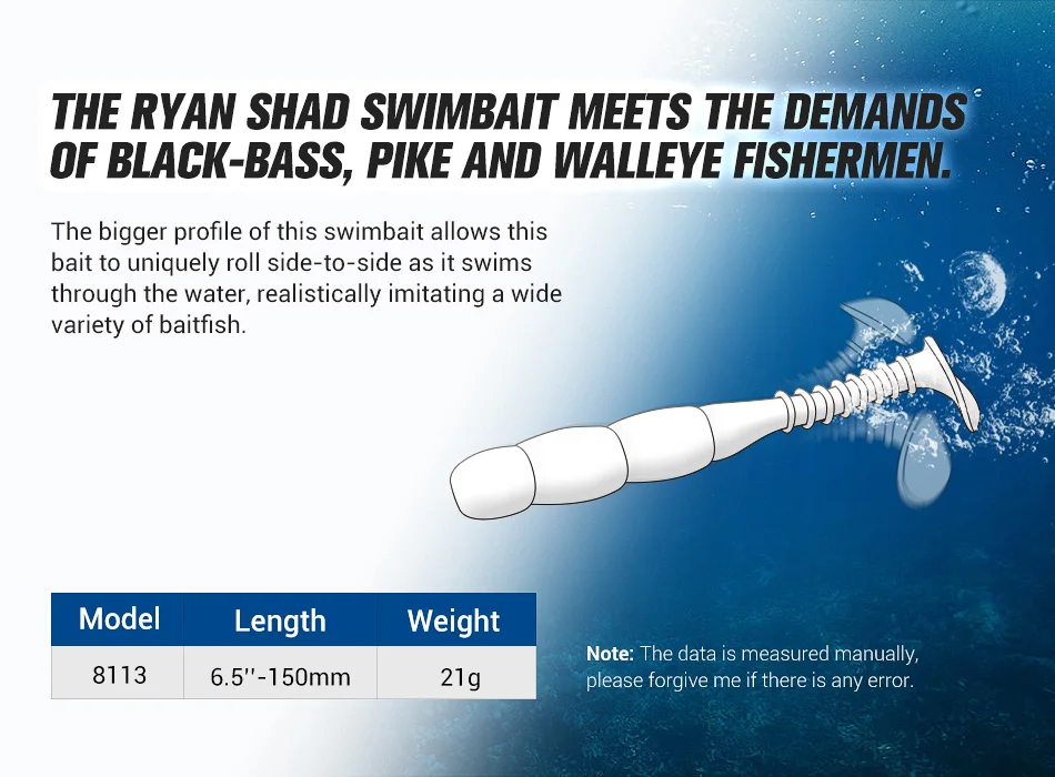 El cebo de natación ryan shad satisface las demandas de los pescadores de lubina negra, lucio y lucioperca.
