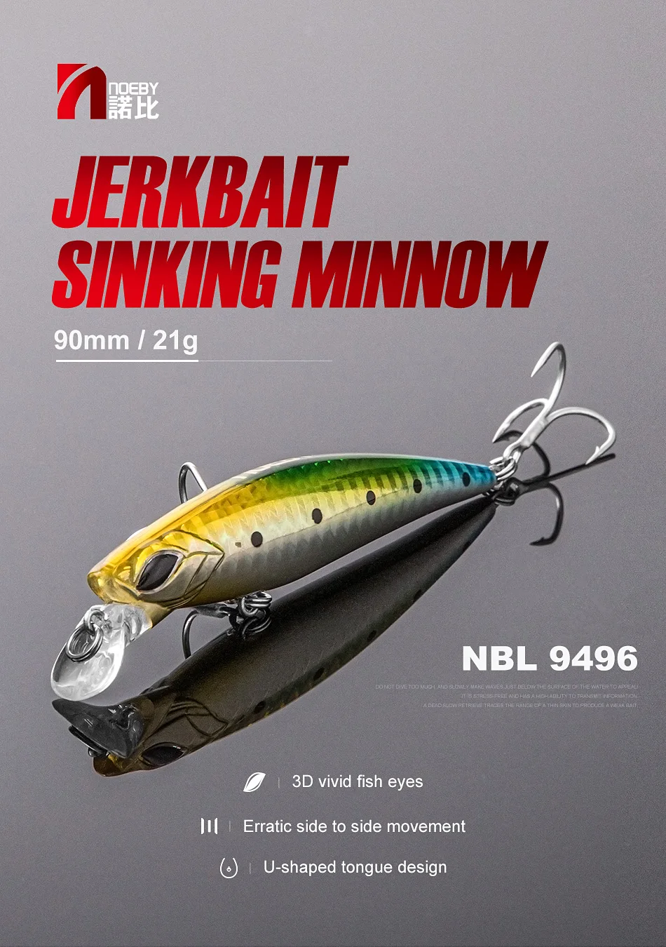 Noeby-Juego de señuelos de pesca de pececillo que se hunden, Jerkbait Wobbler para lubina, cebo duro Artificial, aparejos de pesca, 90mm, 21G, juego de 4 Uds.