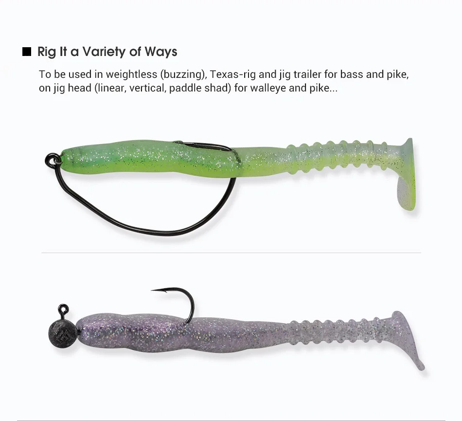 Para ser utilizado en reboques ligeros (zumbido), texas-rig y jig para lubinas y lucios, en jig head (liner, vertical, paddle shad) para walleye y lucio...