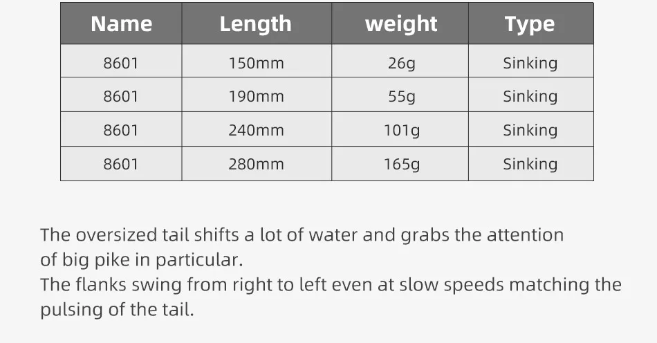 El cuerpo profundo, la muñeca delgada y la cola ancha crean una acción de natación que rotola y parpadea el vientre, incluso a baja velocidad, lo que deja un aroma peludo de grandes depredadores. Es perfecto para jigging, spinning y pesca vertical.