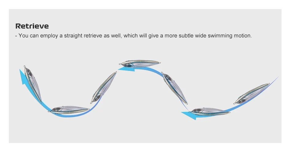 El señuelo se puede trabajar lento o rápido con sacudidas largas o cortas de la punta de la caña. Una recuperación de parada y arranque crea una acción de natación errática que los peces simplemente no pueden resistir.