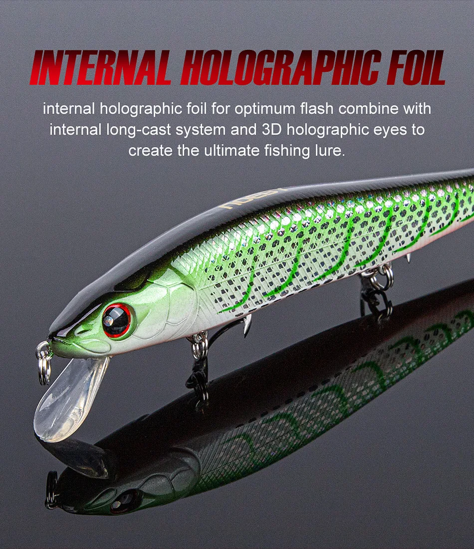 Lámina holográfica interna para una combinación de flash óptima con el sistema interno de lanzamiento largo y ojos holográficos 3D para crear el señuelo de pesca definitivo.