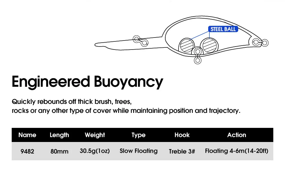 Flotabilidad diseñada Rebotan rápidamente arbustos gruesos, árboles, rocas o cualquier otro tipo de cobertura manteniendo la posición y la trayectoria.