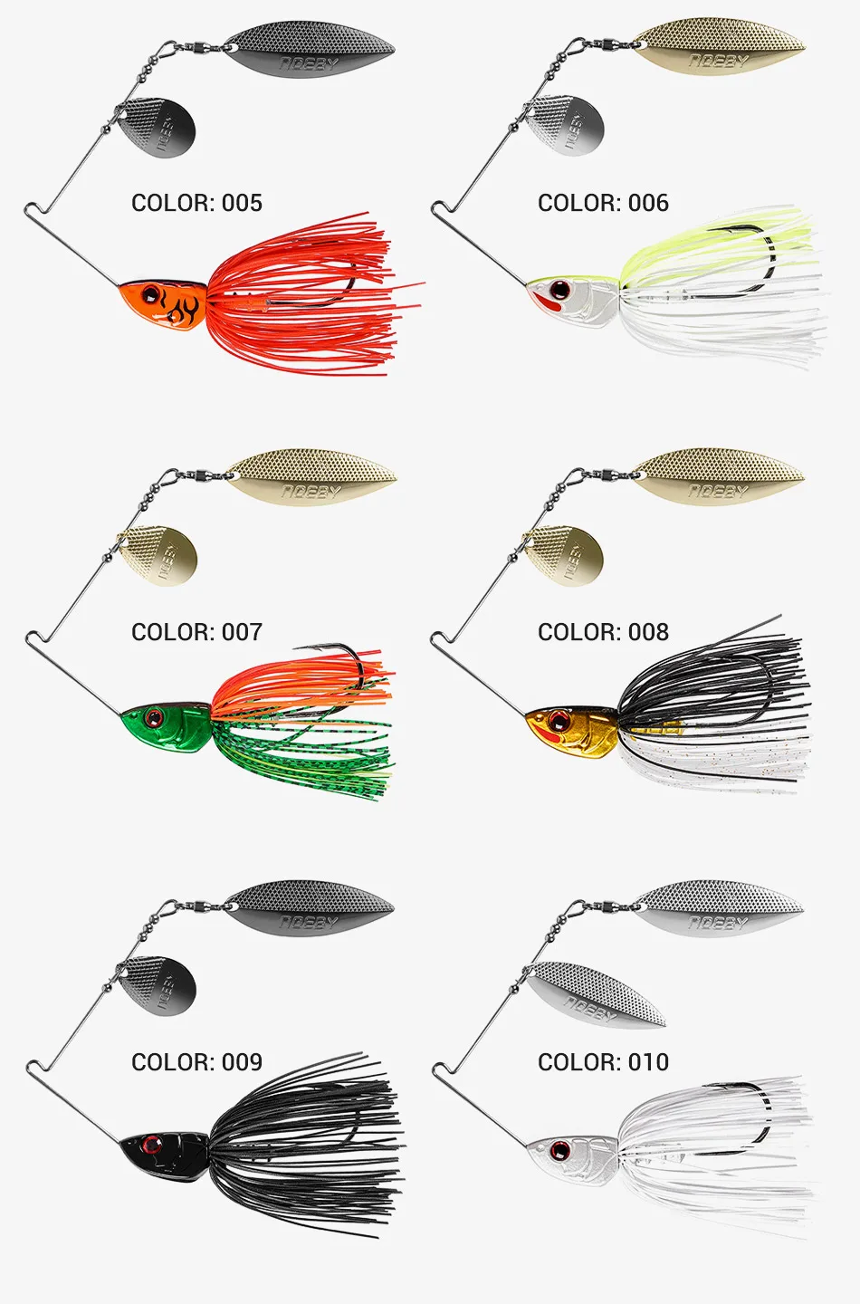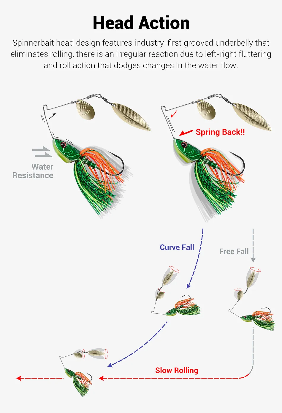 El diseño de la cabeza de Spinnerbait presenta la primera parte inferior ranurada de la industria que elimina el balanceo, hay una reacción irregular debido al aleteo de izquierda a derecha y la acción de balanceo que esquiva los cambios en el flujo de agua.