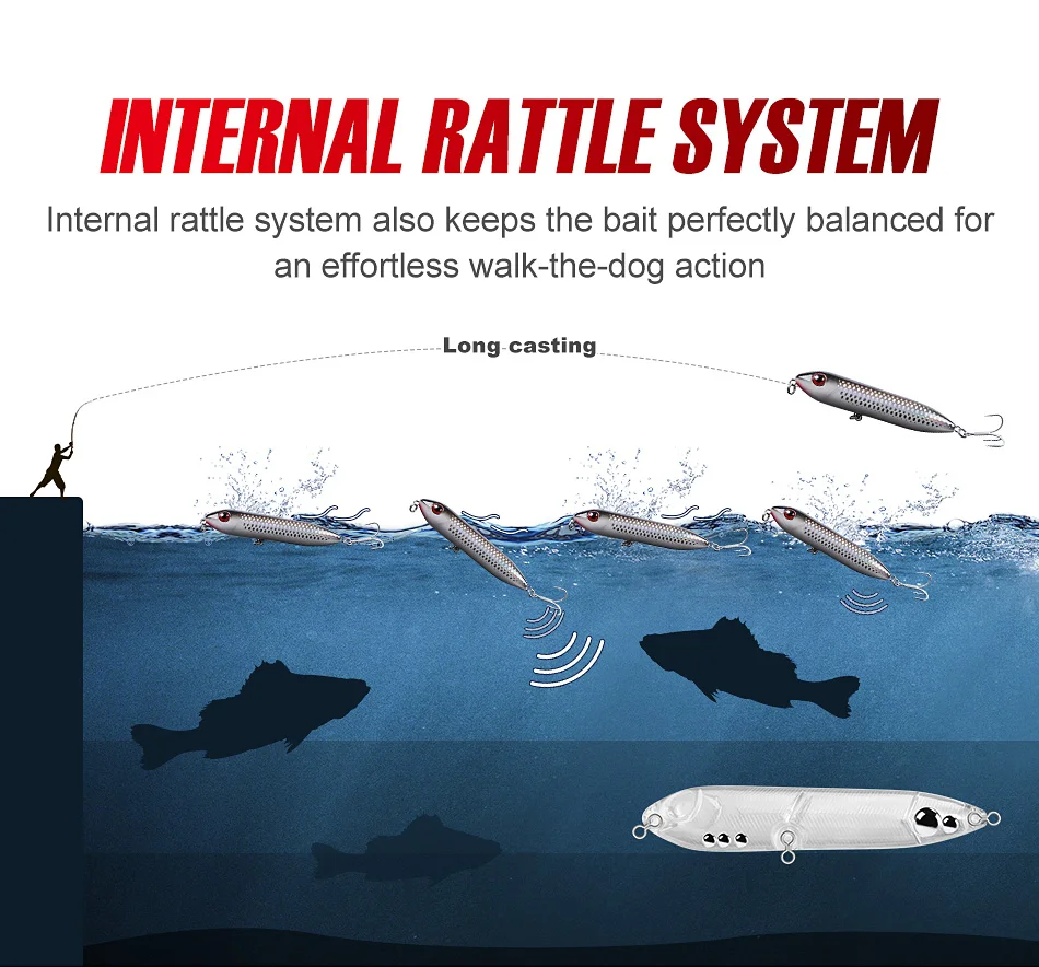 El sistema de sonajero interno también mantiene el cebo perfectamente equilibrado para lograr una acción sin esfuerzo al perro.