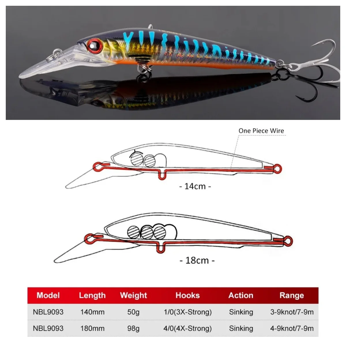 NOEBY Señuelo de pesca de pececillo con curricán grande, 140mm, 50g, 180mm, 98g, Wobblers que se hunde, cebo duro para Lucio, lanzamiento largo, señuelos de pesca de mar