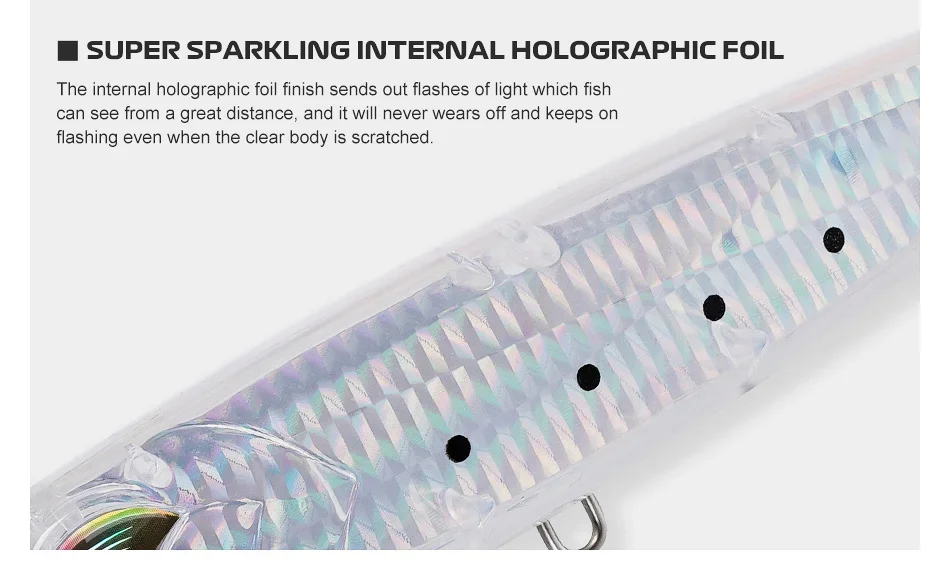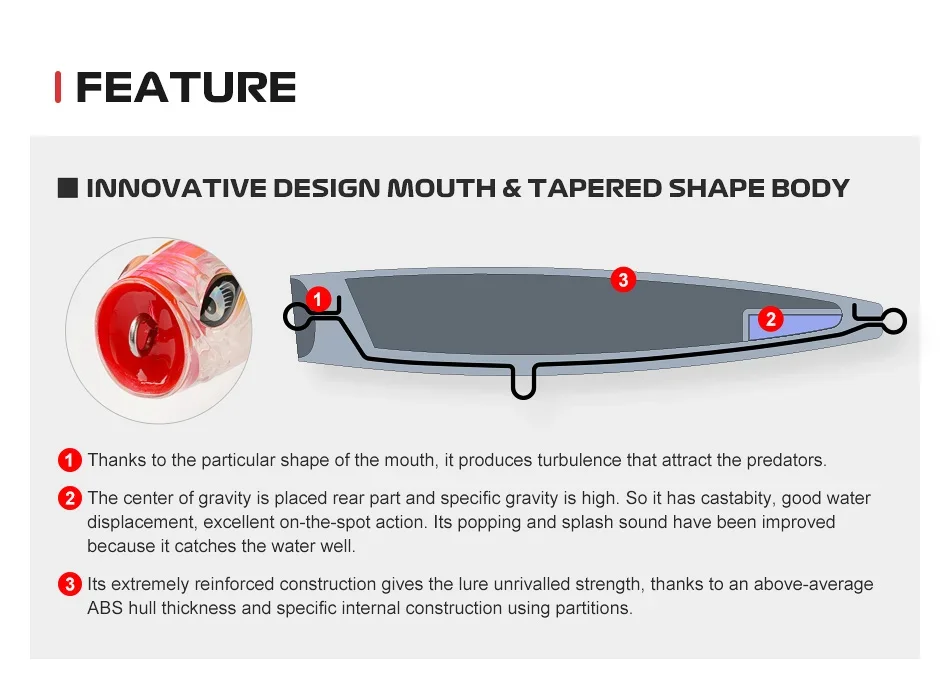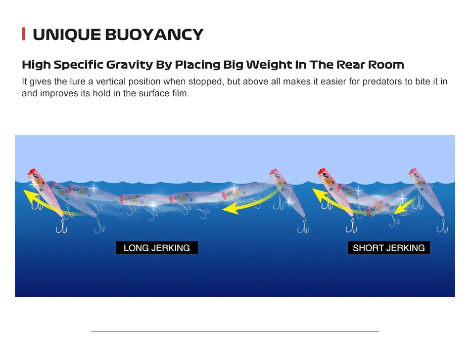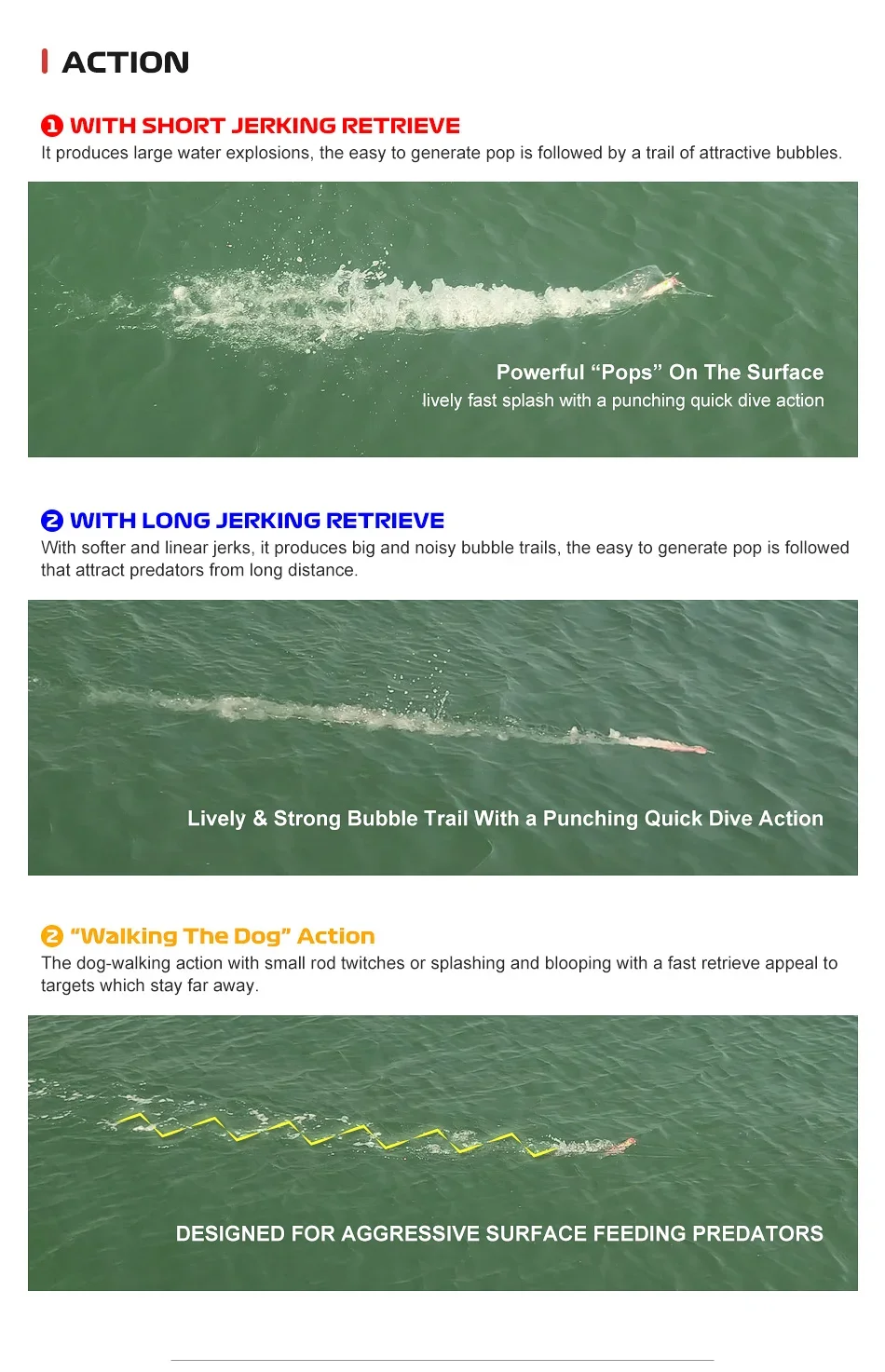 Su forma larga y su sección transversal en forma de huevo hacen que este señuelo sea fácil de usar, lo que le permite disfrutar de todo su potencial tanto en acción "Popper" como "pasear al perro".