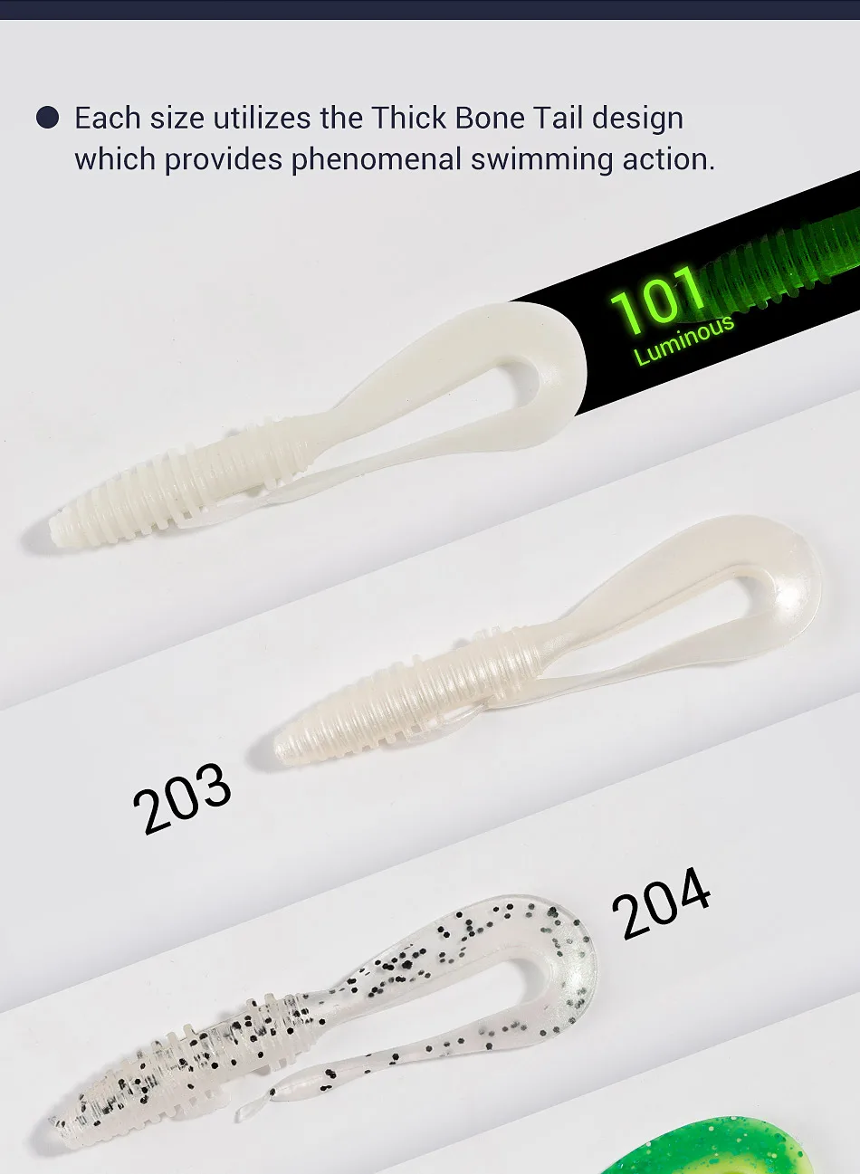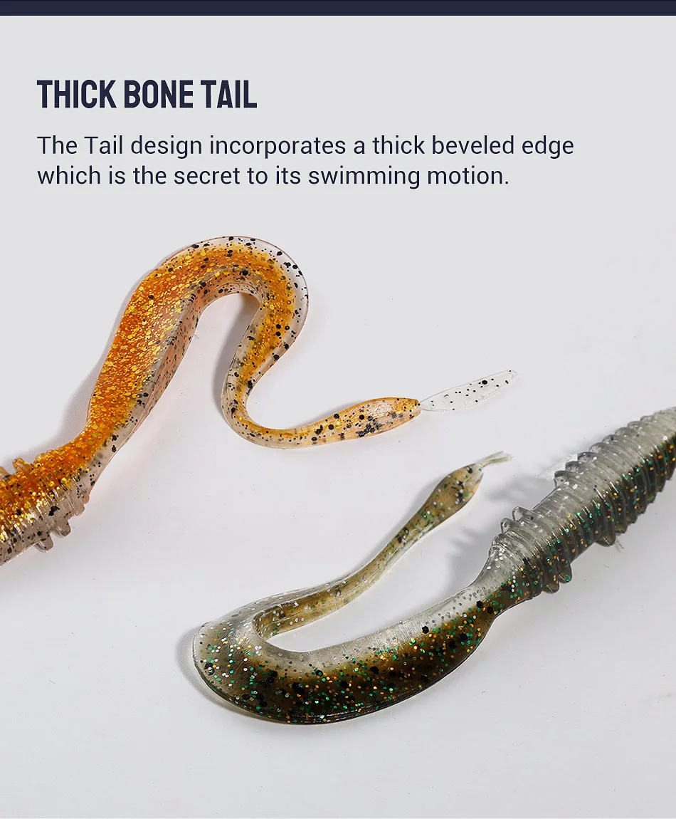 Cada tamaño utiliza el diseño de cola de hueso gruesa que proporciona una acción de natación fenomenal.
