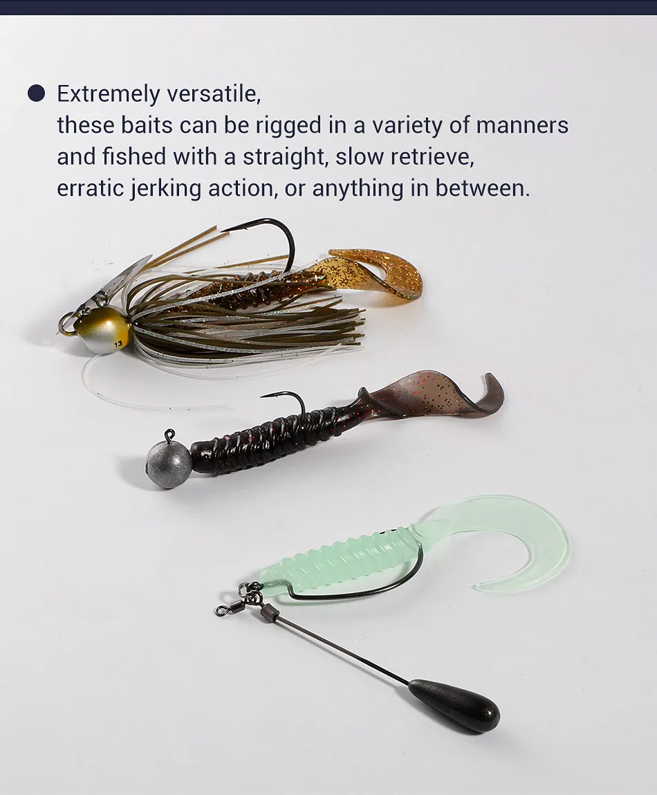 Estos cebos se pueden amoldar de diferentes maneras y pescar con una acción de sacudida recta, lenta, errática o cualquier cosa.