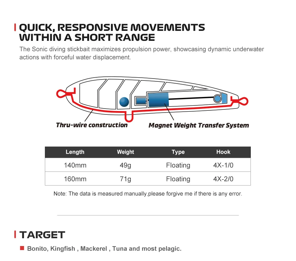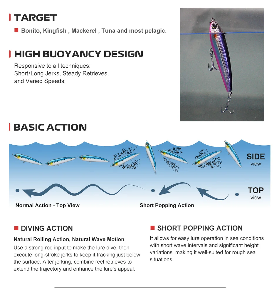 El equilibrio de peso del sistema de movimiento del centro de gravedad y la forma de la cabeza gruesa atraen al objetivo con una acción de oscilación de natación con un fuerte empuje en el agua.