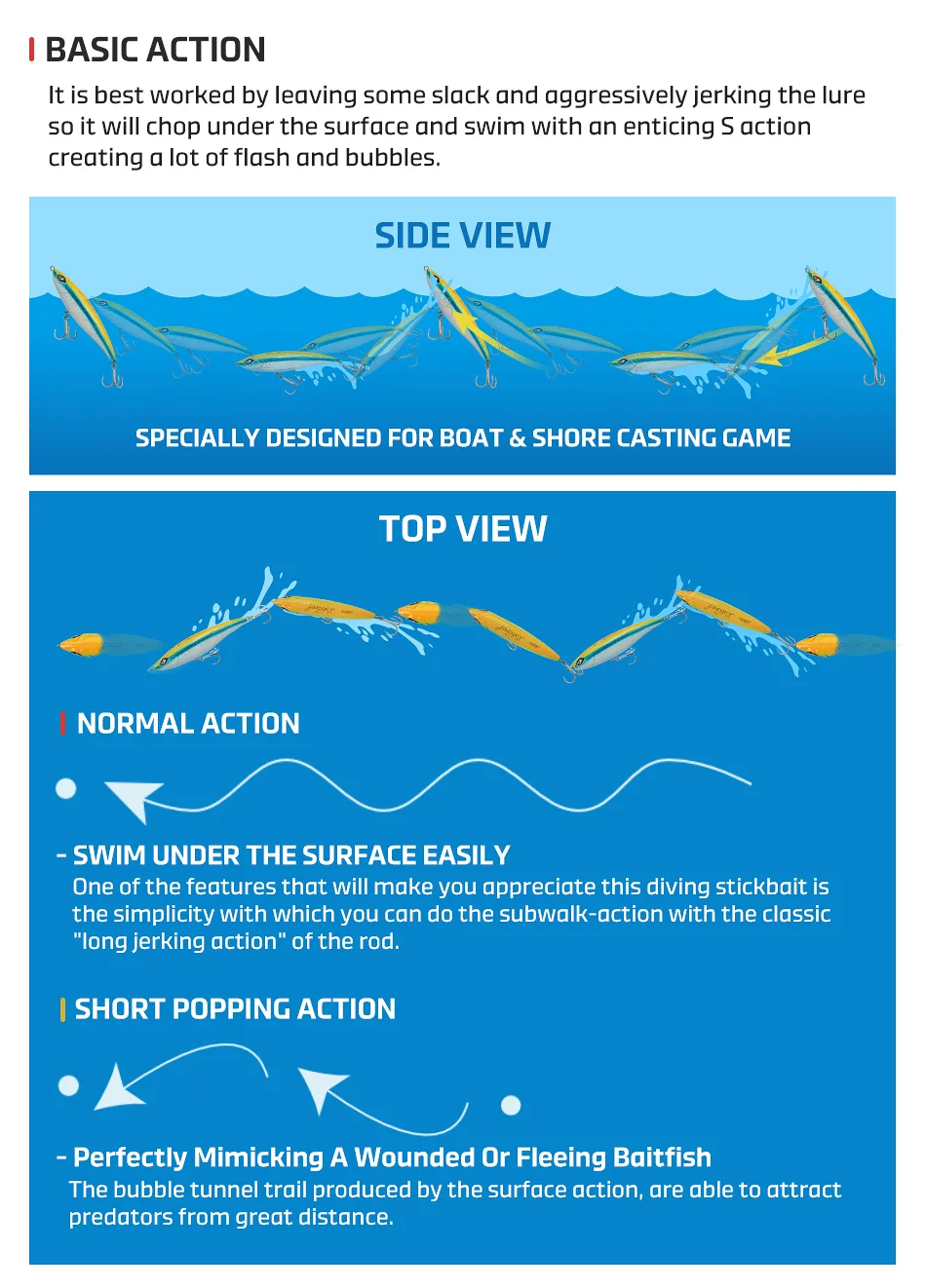 Lo mejor es trabajar dejando un poco de holgura y sacudiendo agresivamente el señuelo para que se corte debajo de la superficie y nade con una atractiva acción S creando muchos destellos y burbujas.