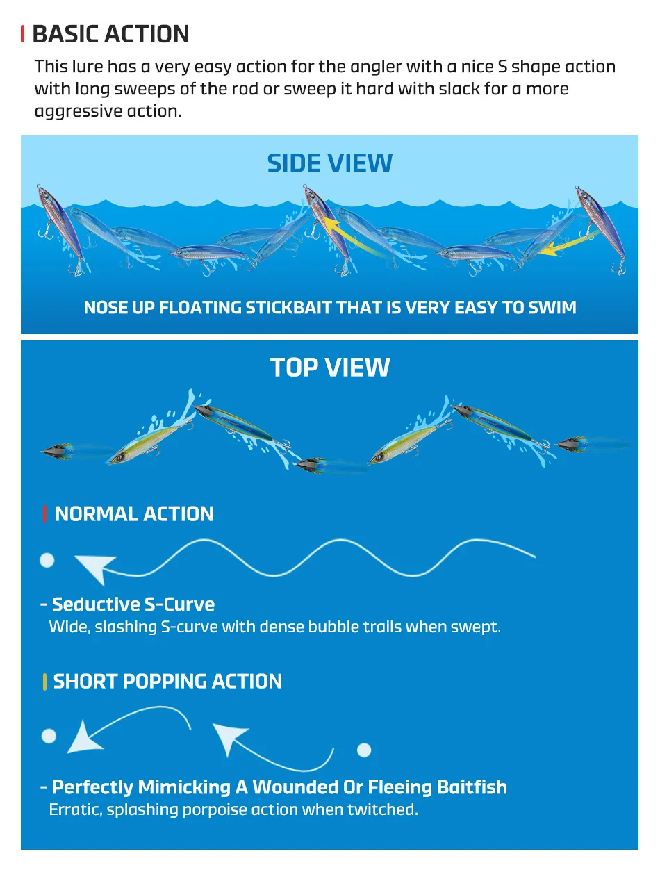 Este señuelo tiene una acción muy fácil para el pescador con una bonita acción en forma de S con un barrido largo de la caña o la barre con fuerza de holgura para una acción más agresiva.