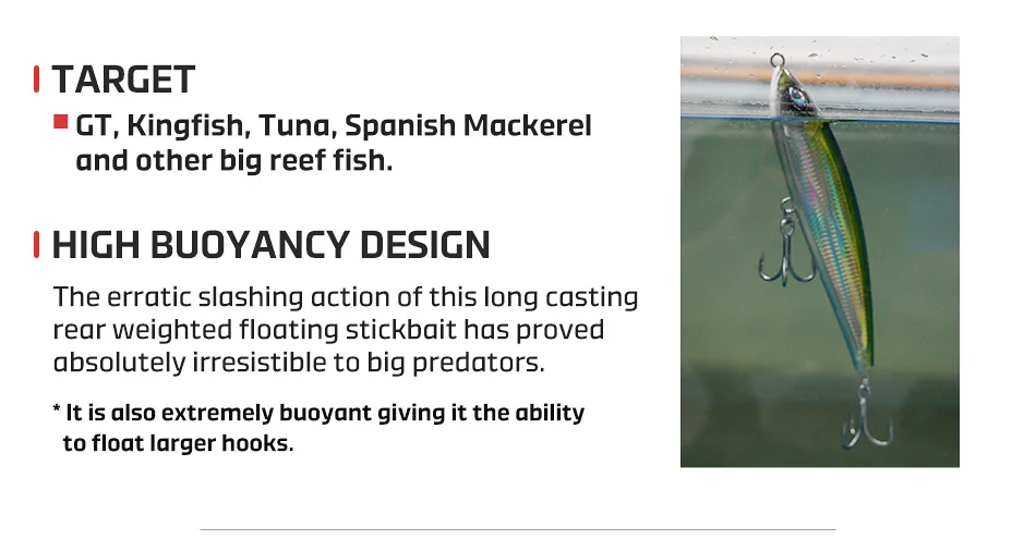 Ha sido diseñado para perseguir a los rebanzos y atún monstruo, pero también atraerá la atención de depredadores como el gran GT, la caballa y los grandes peces de arrecife.