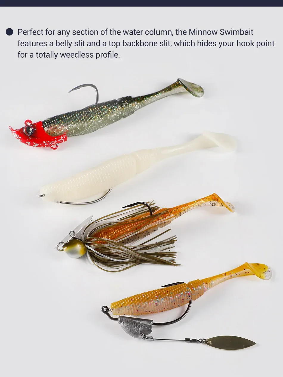 Perfect for any section of the water column, the Minnow Swimbait features a belly slit and a top backbone slit, which hides your hook point for a totally weedless profile.
