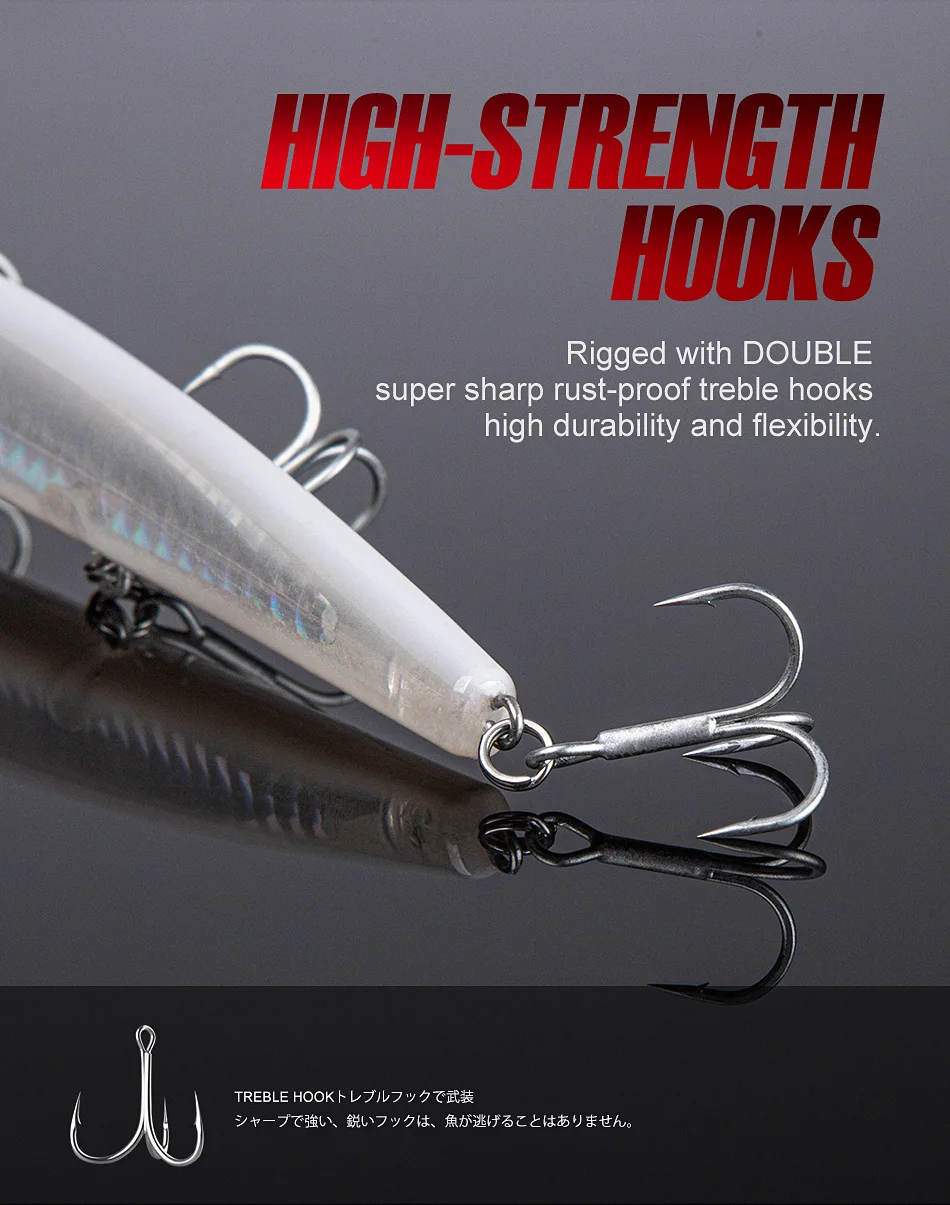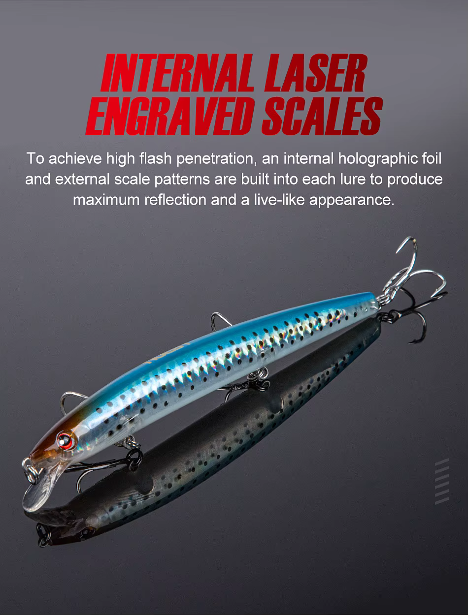 5. Para lograr una alta penetración del flash, cada señuelo incorpora una lámina holográfica interna y patrones de escala externa para producir el máximo reflejo y un aspecto vivo.