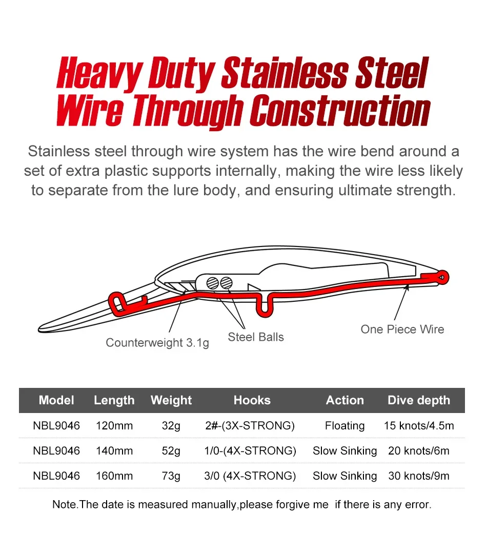 1.Equipo de alambre de acero inoxidable de alta resistencia a través de la construcción, el sistema de alambre pasante de acero inoxidable tiene la curvatura del alambre alrededor de un conjunto de soportes de plástico adicionales en el interior, lo que hace que el cable sea menos probable que se separe del cuerpo del señuelo y garantiza la máxima resistencia.