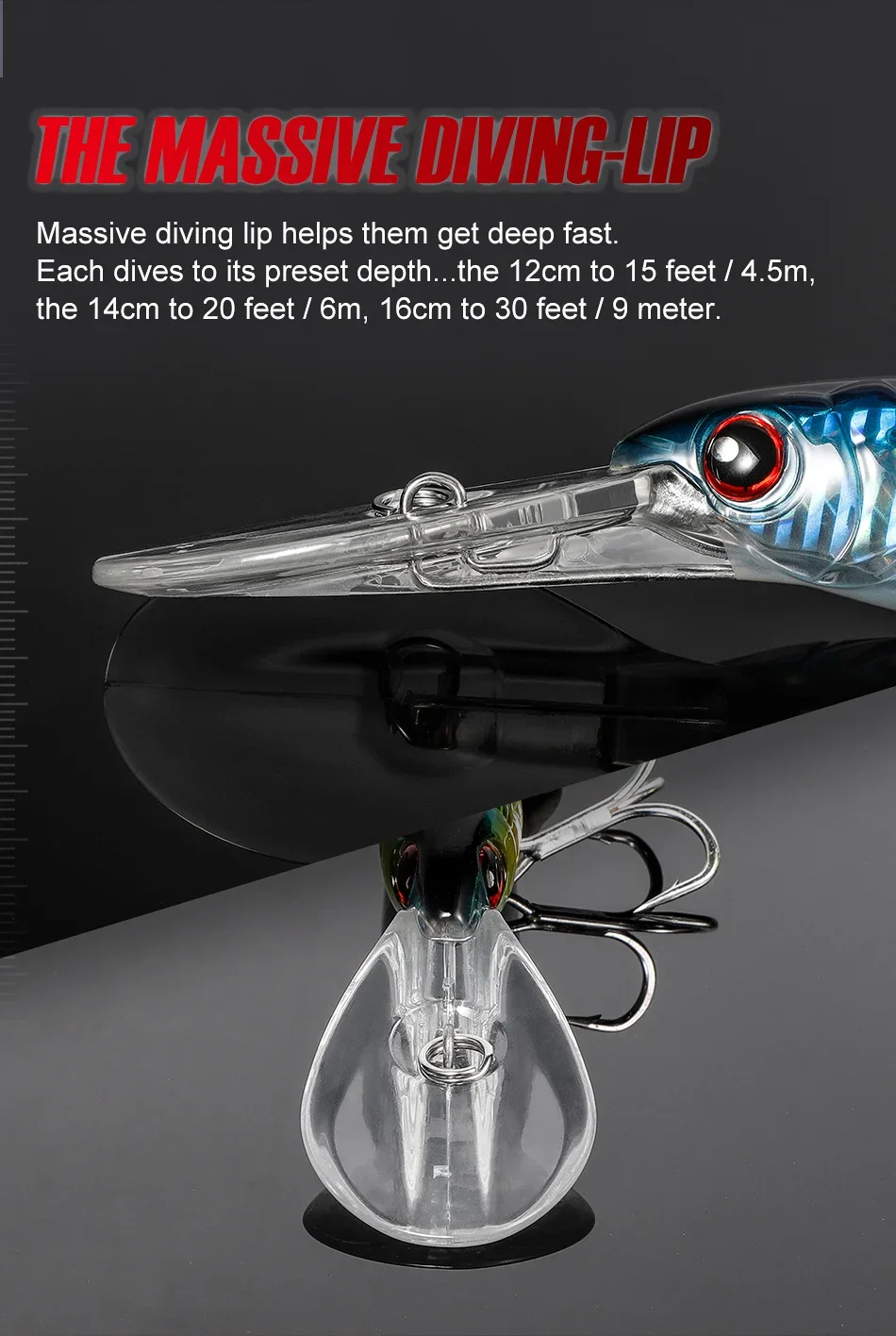 2.El enorme labio de buceo y el enorme labio de buceo les ayuda a llegar profundamente rápido, cada uno se sumerge a su profundidad preestablecida... los 12 cm a 15 pies/4,5 metros, los 14 cm a 20 pies/6 metros, los 16 cm a 30 pies/9 metros.