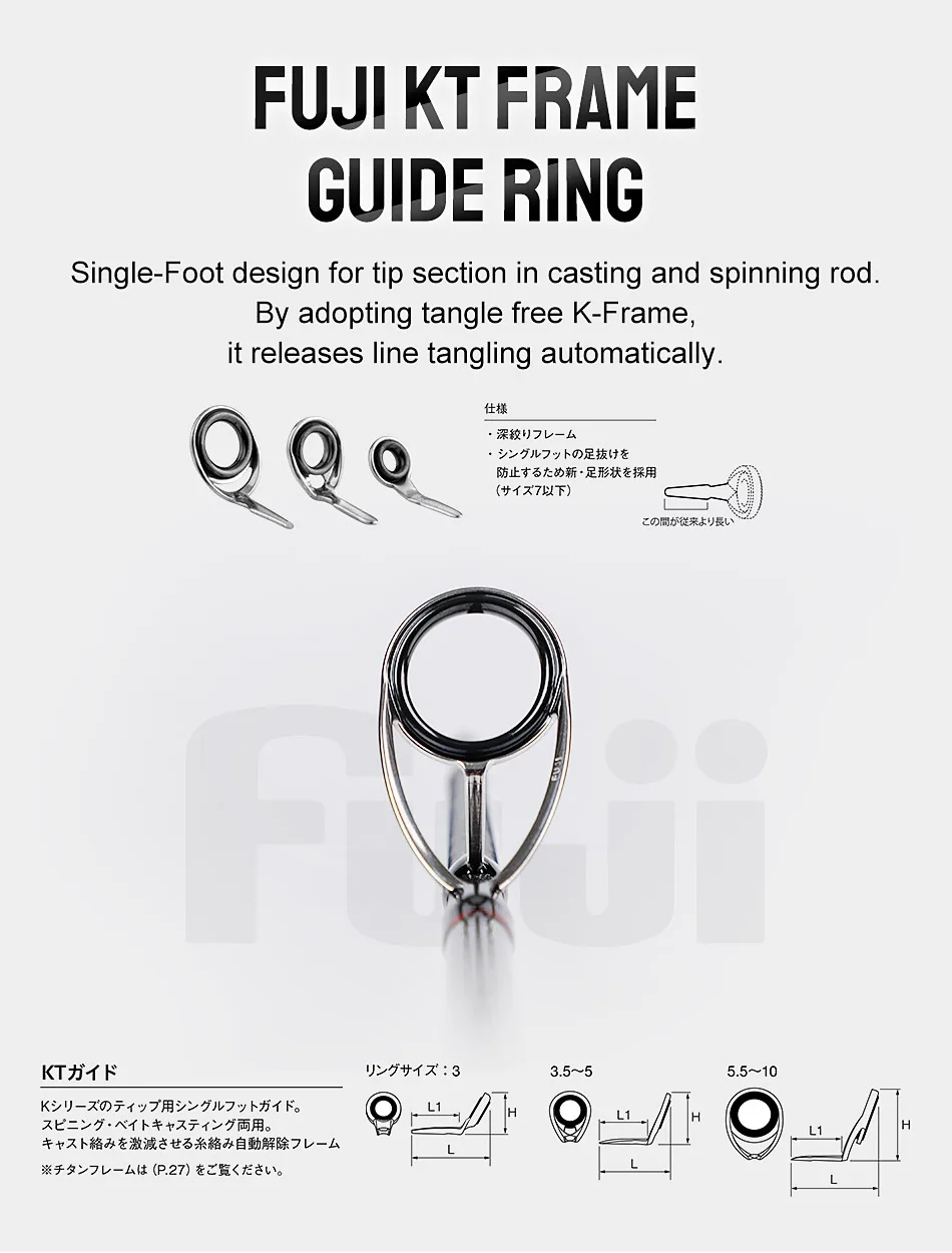 3. FUJI KT frame guide ring, single-foot design for tip section in casting and spinning rod, by adopting tangle free K-frame, it releases line tangling automatically.