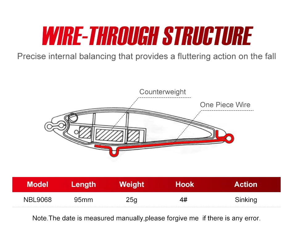 El señuelo tiene una caída muy rápida de peces muertos, capacidad de lanzamiento incluso más larga y se puede utilizar con espasmos más agresivos, incluso en condiciones climáticas adversas para peces activos.