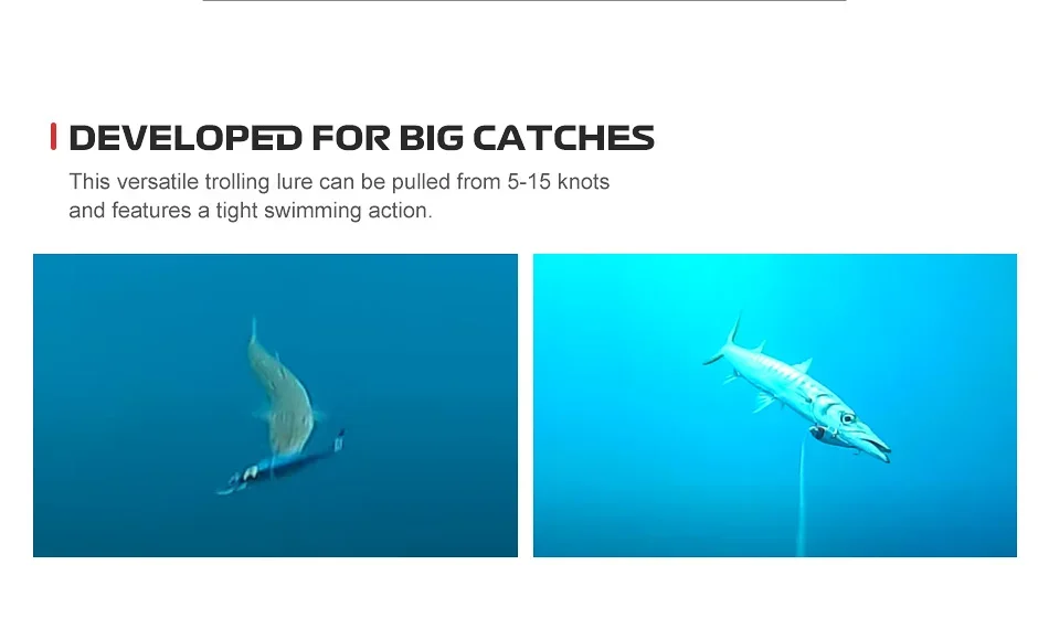 Este versátil señuelo de pesca con curricán se puede tirar de 5 a 15 nudos y presenta una acción de natación apretada.