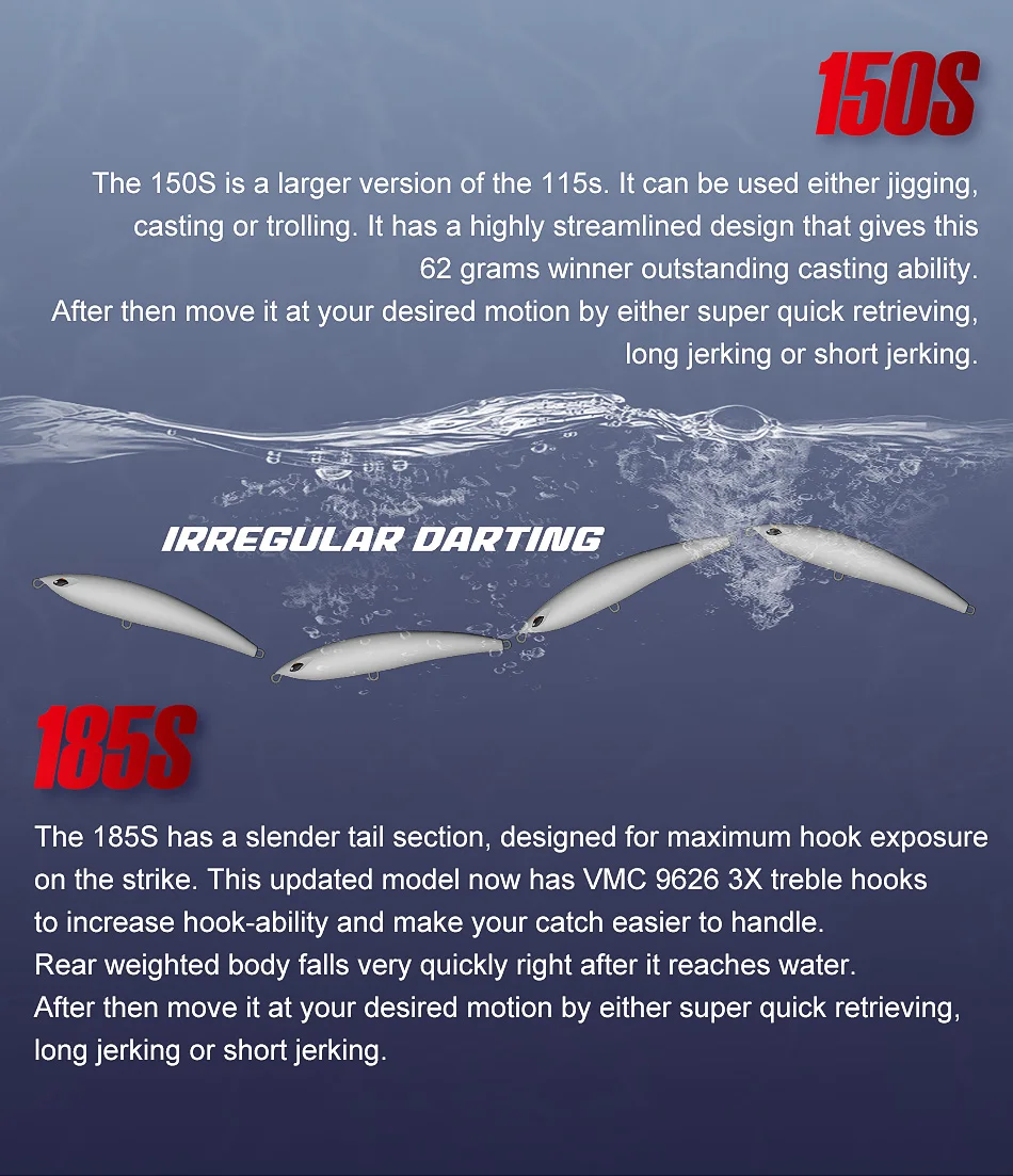 El 150S es una versión más grande del 115S. Se puede utilizar jigging, casting o corrico. Tiene un diseño altamente aerodinámico que le da a este ganador de 62 gramos una excelente capacidad de lanzamiento. Después de luego muévalo al movimiento deseado mediante una recuperación súper rápida, un tirón largo o un tirón corto.