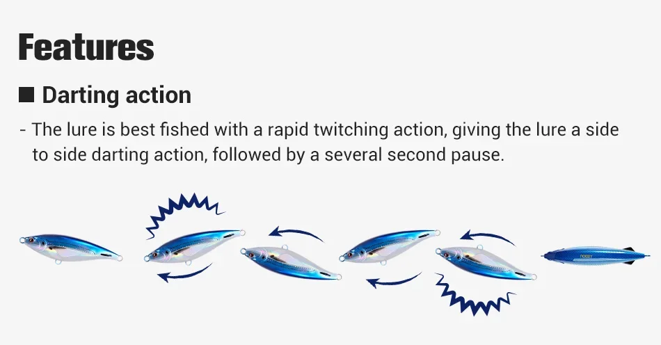El señuelo se pesca mejor con una acción de contracción rápida, lo que le da al señuelo una acción de dardo de lado a lado, seguida de una pausa de varios segundos.