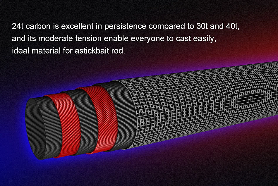24t carbon is excellent in persistence compared to 30t and 40t, and its moderate tension enable everyone to cast easily, ideal material for a stickbait rod.