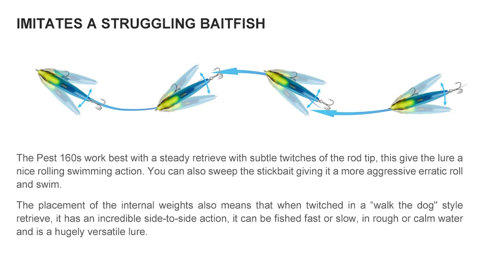 El Pest 160 funciona mejor con una recuperación constante con sutiles movimientos de la punta de la caña, lo que le da al señuelo una agradable acción de natación rodante.También puedes barrer el stickbait dándole un balanceo errático y nadar más agresivos.