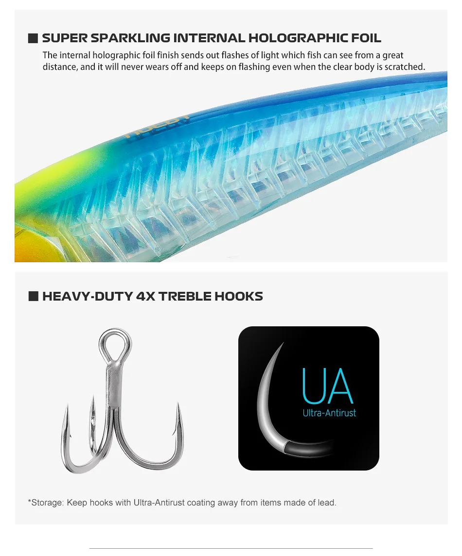 El acabado de lámina holográfica interna envía destellos de luz que los peces pueden ver desde una gran distancia, y nunca se desgastará y seguirá parpadeando incluso cuando el cuerpo transparente se raye.