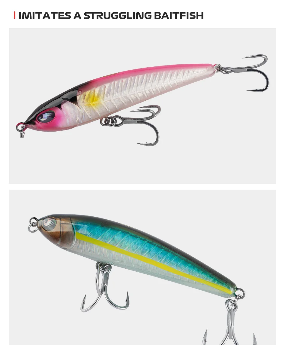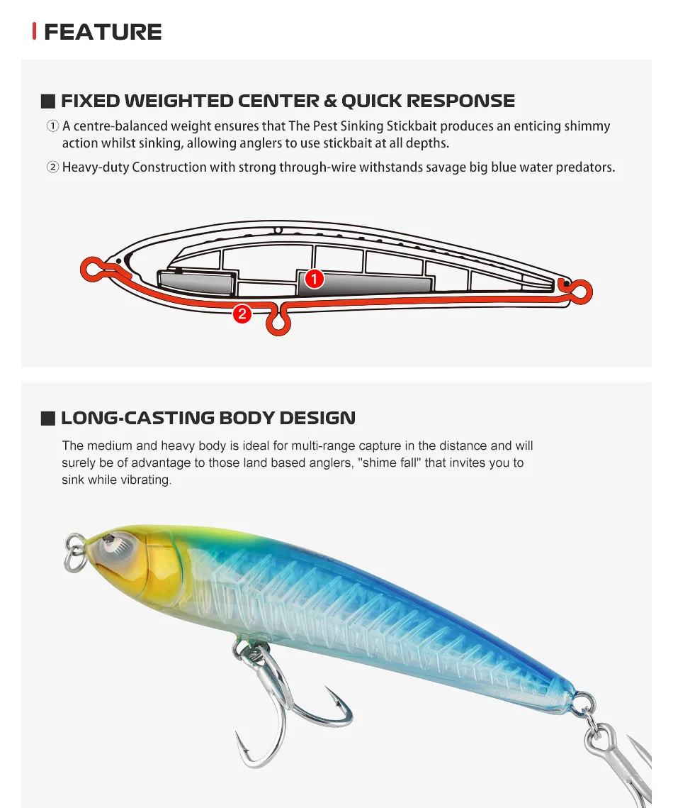 1Un peso equilibrado por el centro garantiza que el Pest Sinking Stickbait produzca una acción brillante atractiva mientras se hunde, lo que permite a los pescadores usar el stickbait en todas las profundidades.