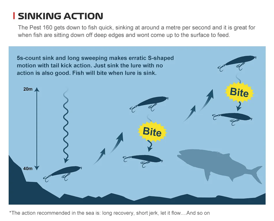 El Pest 160 se baja para pescar rápidamente, se hunde alrededor de un metro por segundo y es ideal para cuando los peces están sentados de los bordes profundos y no llegarán a la superficie para alimentarse.