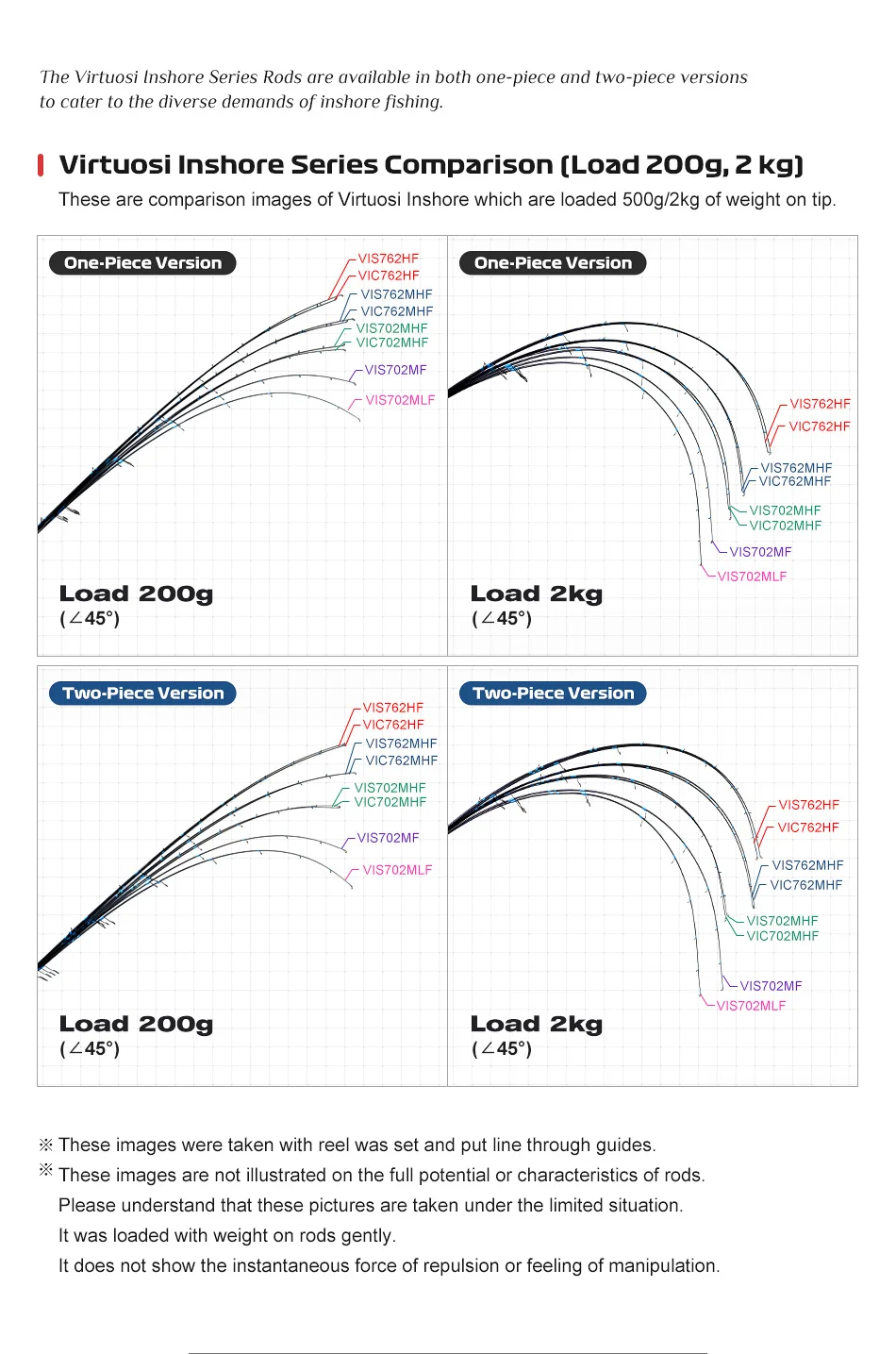 Se trata de imágenes comparativas de Virtuosi Inshore que cargan 500 g/2 kg de peso en la punta.