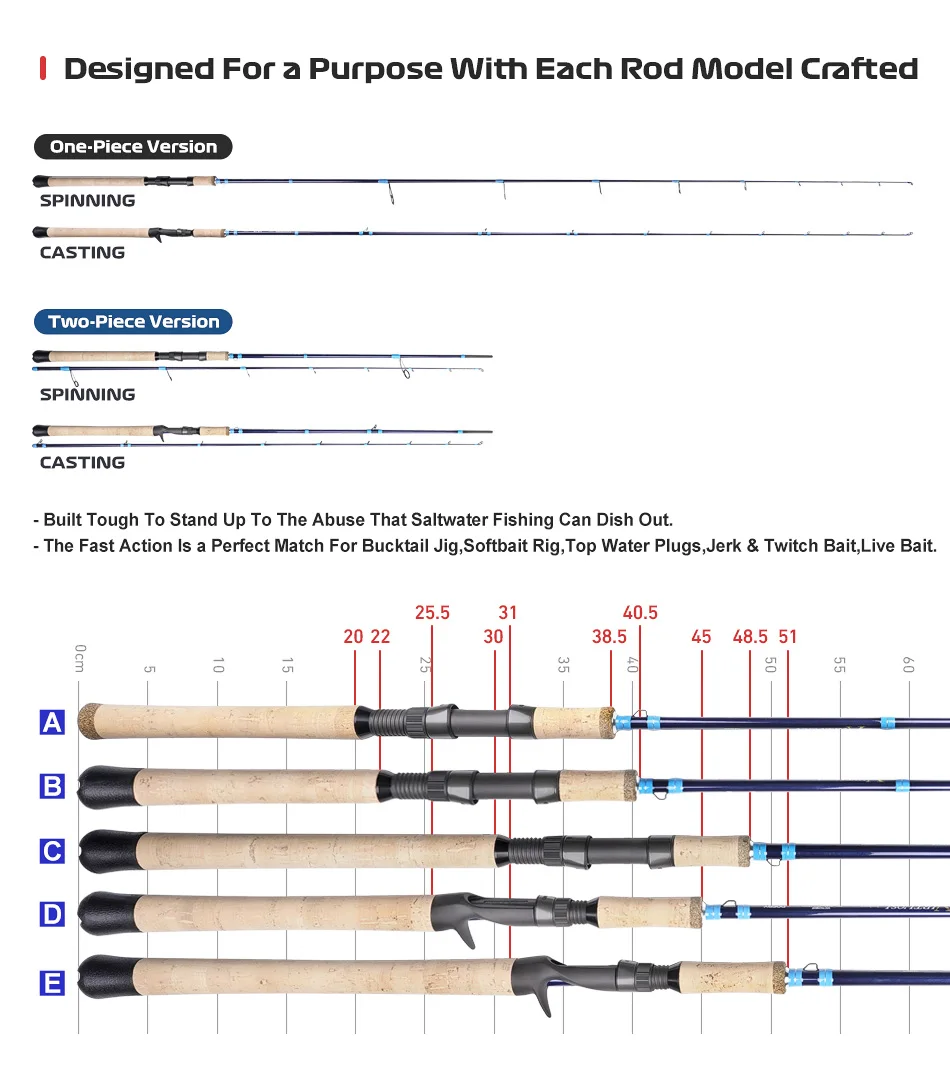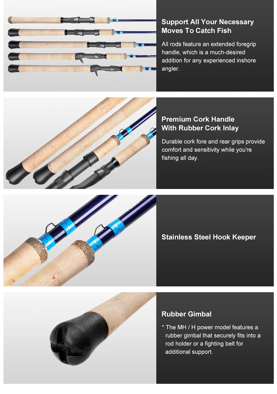 Todas las cañas cuentan con un mango de salto alto extendido, que es un complemento muy querido para cualquier pescador costero experimentado.