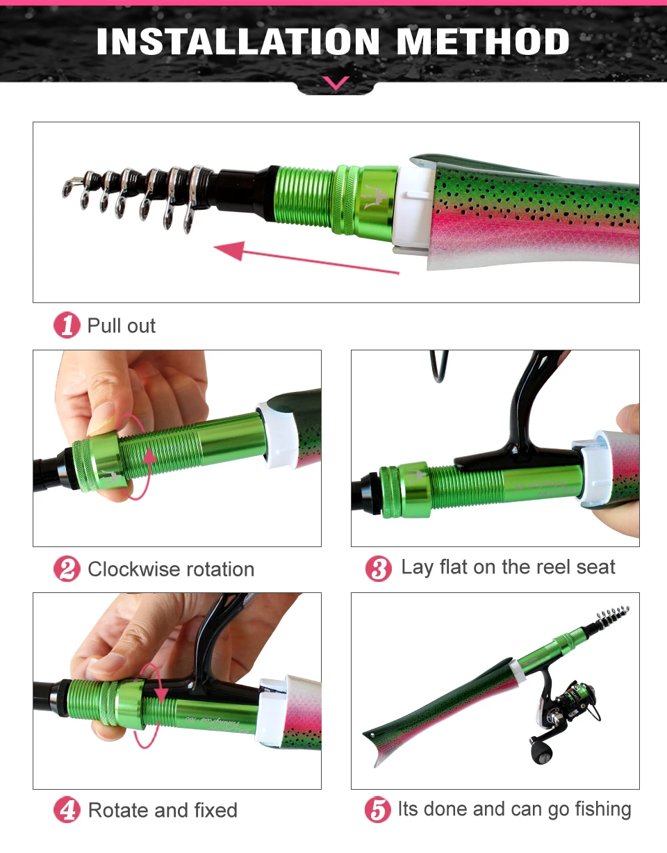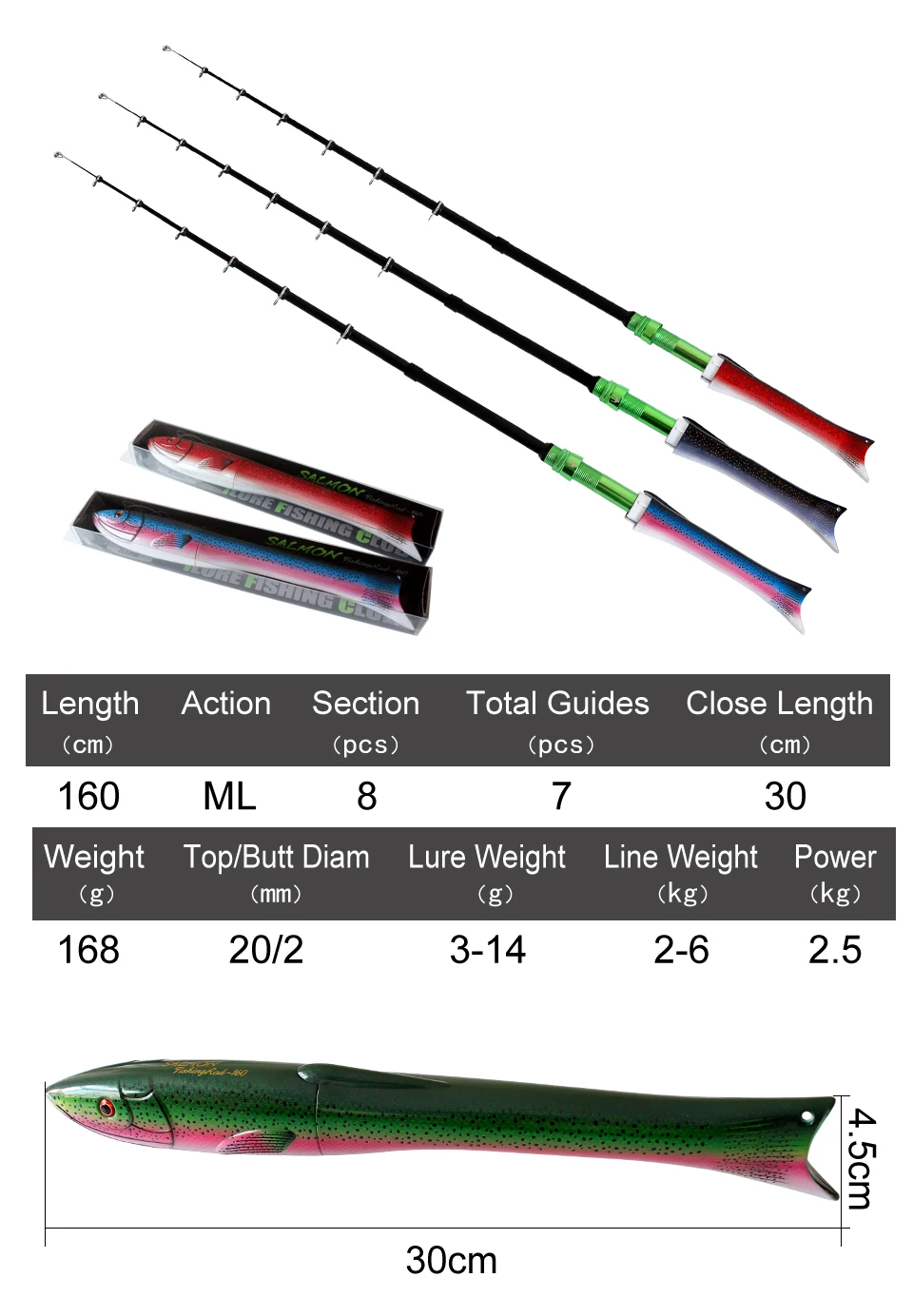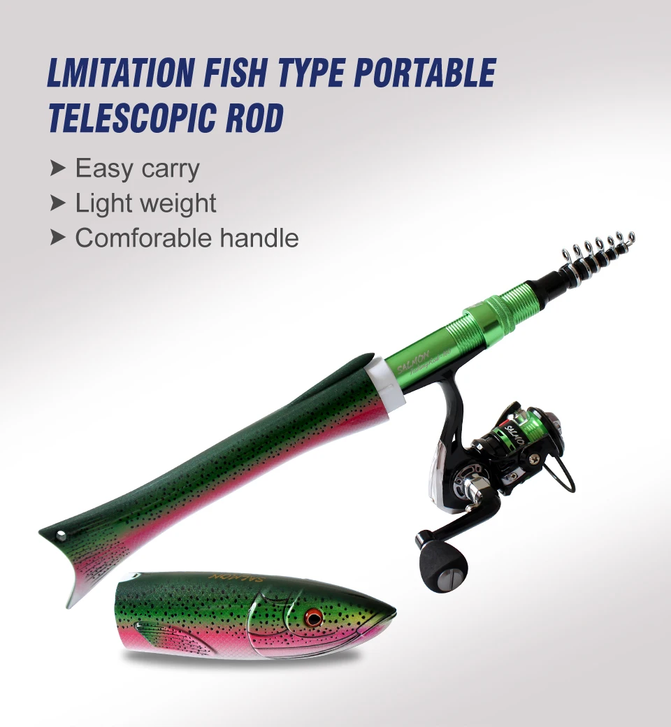 Nueva caña de pescar artesanal, exquisita y hermosa, hecha de fibra de carbono, fuerte y duradera. Es fácil de llevar al salir o viajar, y la forma única de pez también se puede colocar en casa como una obra de arte.