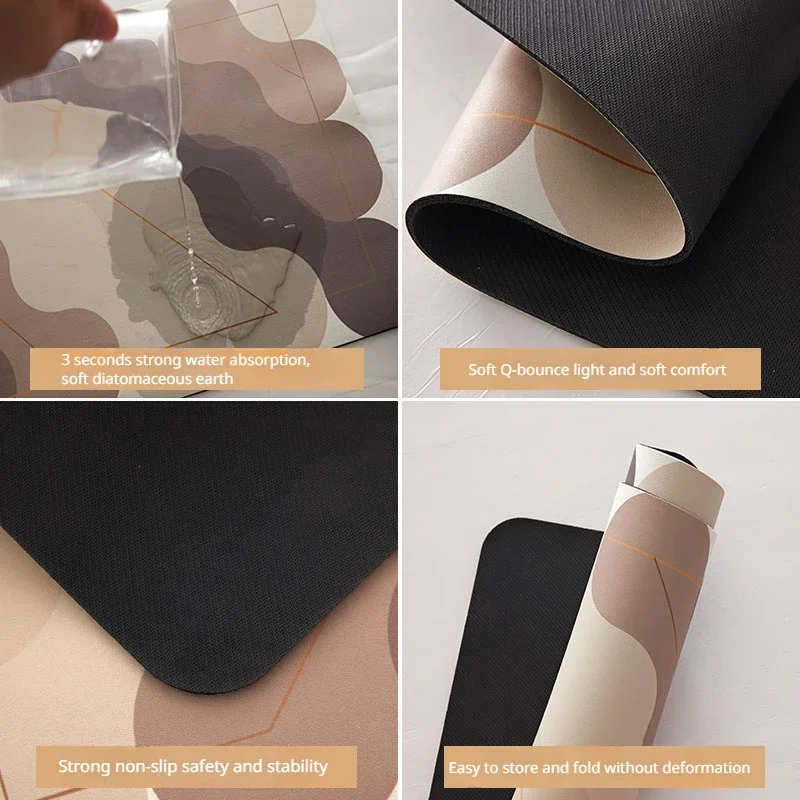 Características: 3 segundos de fuerte absorción de agua, tierra de diatomeas suave Suave Q-bounce ligero y suave confort Fuerte seguridad y estabilidad antideslizantes. Fácil de guardar y plegar sin deformarse.