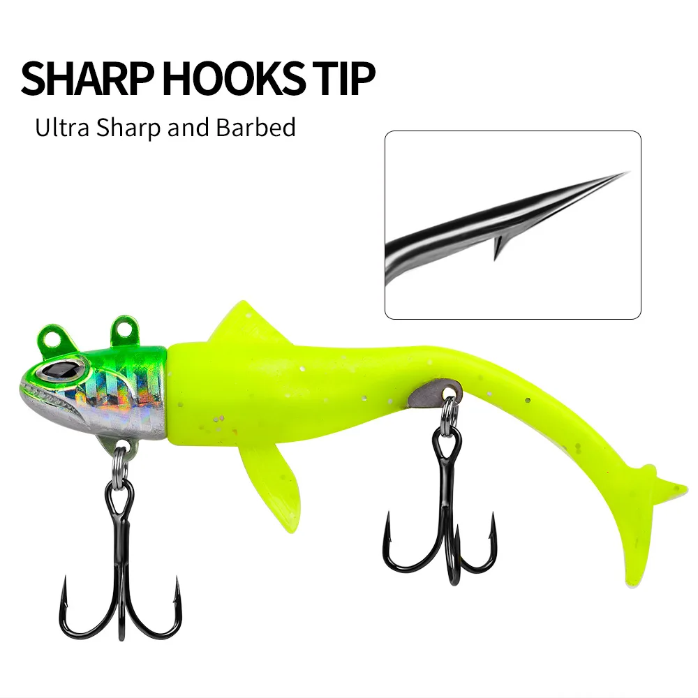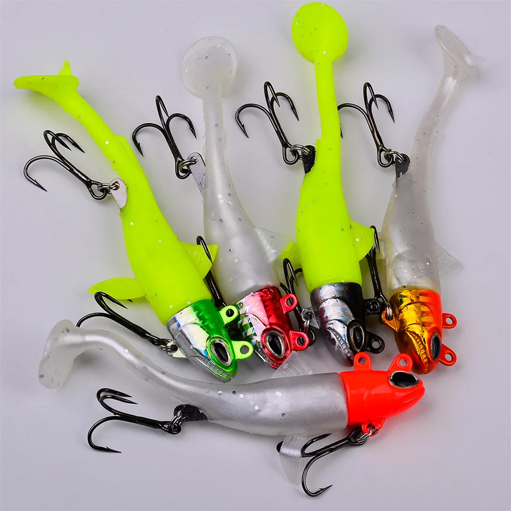 ¡Nueva llegada! Señuelos de Pesca de plomo en forma de pez con cola en T, cebo blando y anzuelo de tres anclajes, ¡obtenga más peces ahora! 5 paquetes