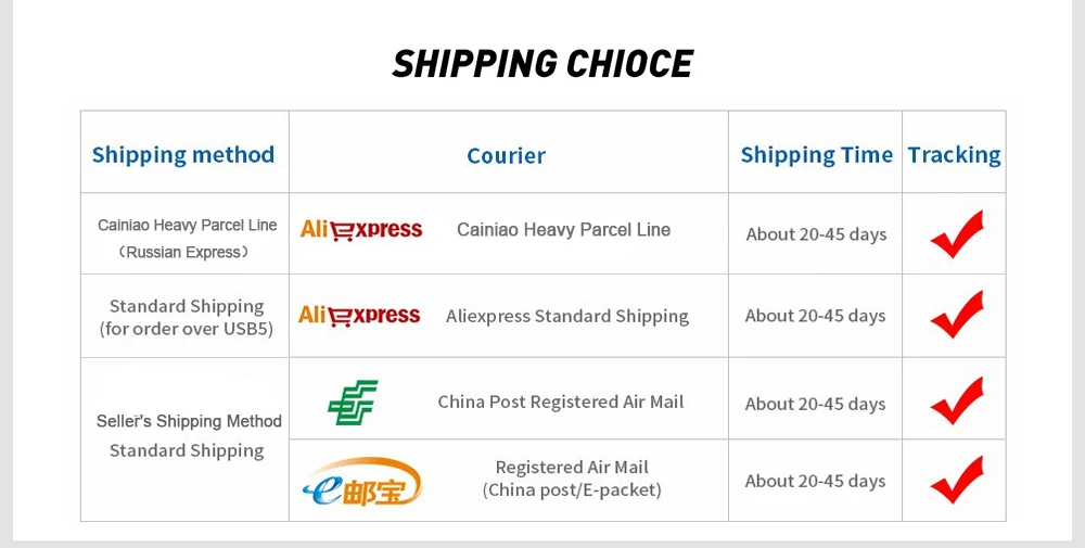 Todos los pedidos serán enviados por la oficina de correos Express, y generalmente llegan alrededor de 20-45 días,