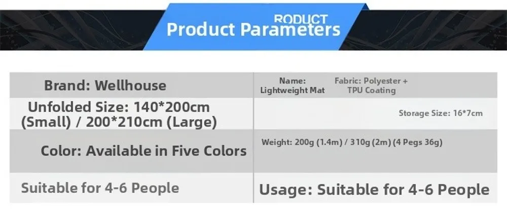 Cantidad: 1 juego Hecho de tela Oxford 210D con procesamiento impermeable único, lo protege a usted y a sus pertenencias de la humedad.También se puede utilizar como dosel solar/lluvia fijando la alfombra a través de la boquilla.Viene con una bolsa con cordón, plegable en un tamaño compacto para un transporte cómodo.Ideal para acampar, playa, picnic, tienda de campaña, etc.