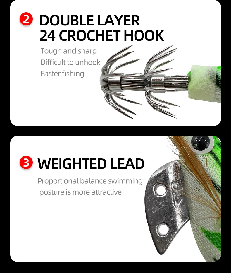 【color】:Las plantillas de calamar son un pequeño señuelo que se asemeja a un pez cebo o un gambero con un peso en forma de quilla en la parte delantera y filas de puntas afiladas sin barril en la parte trasera.Las plantillas de calamar suelen tener dos capas compuestas por la parte inferior y una capa exterior de tela, cada una normalmente tiene un color diferente.