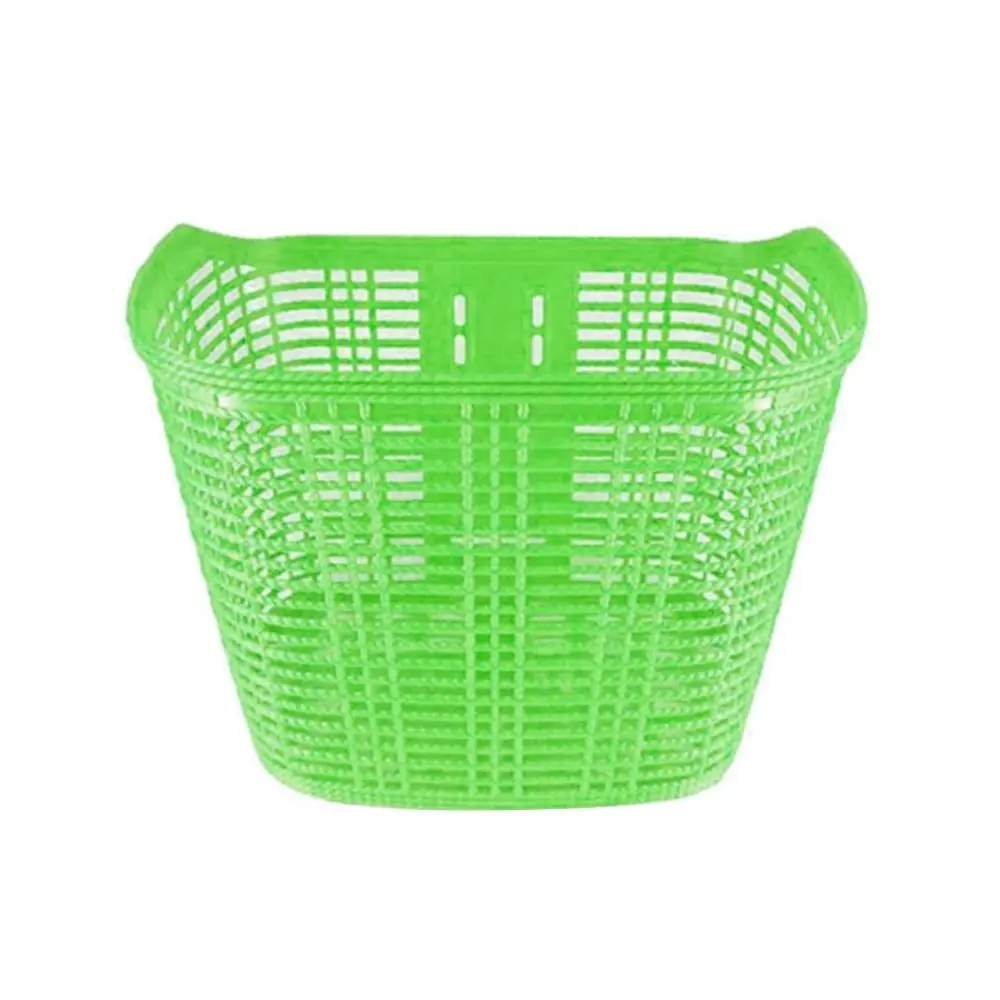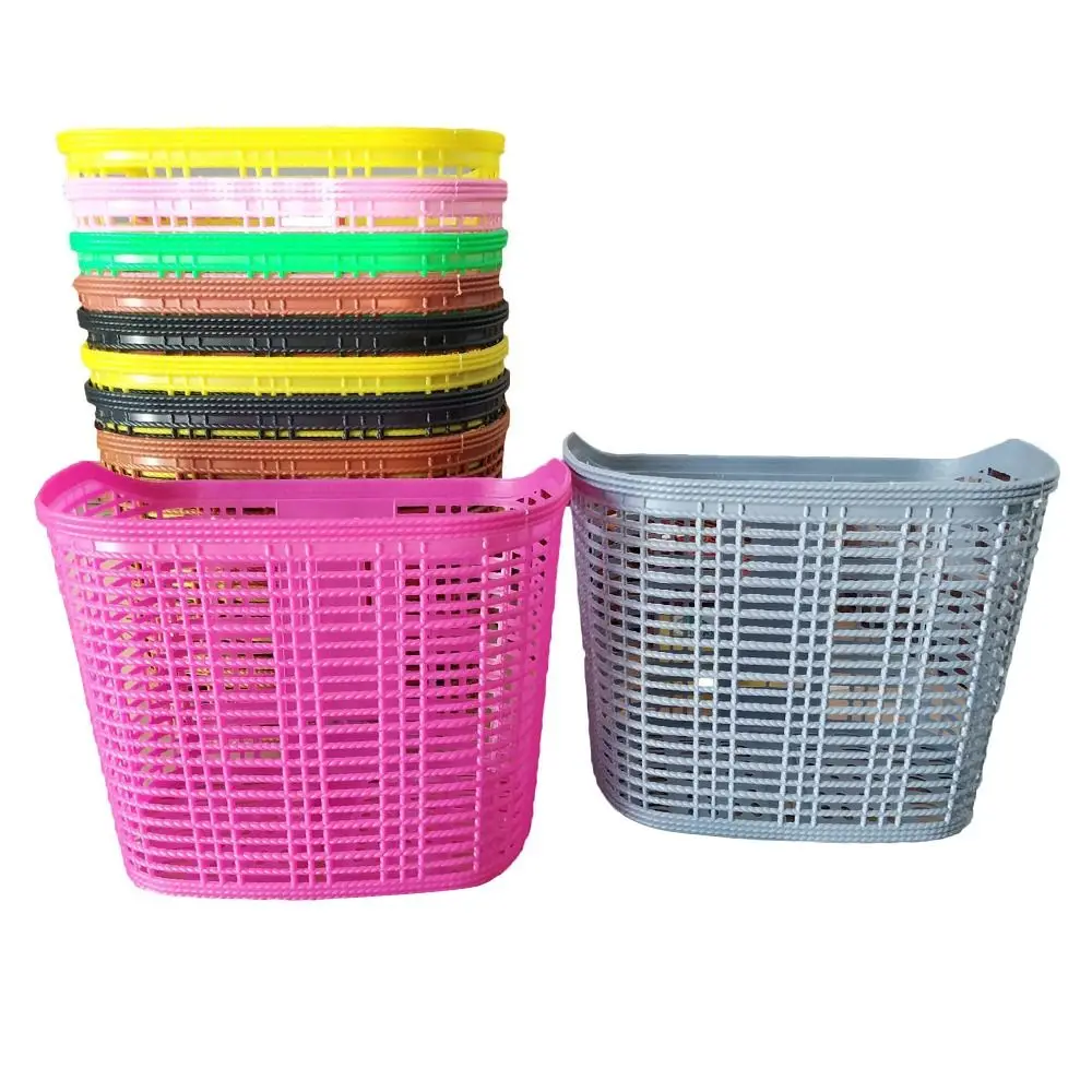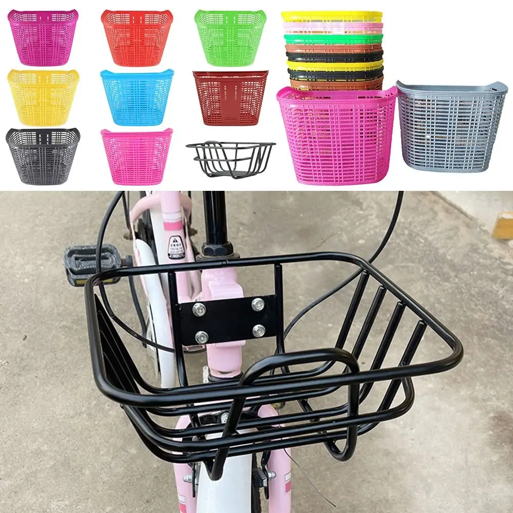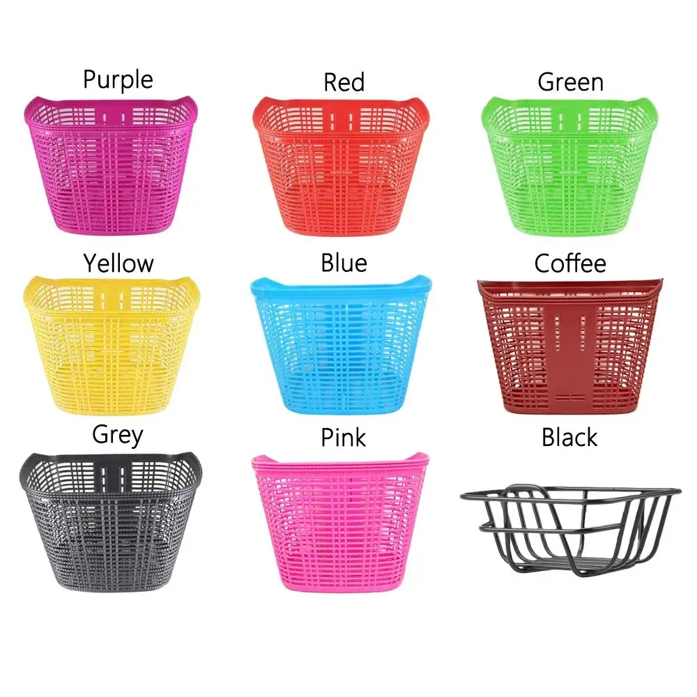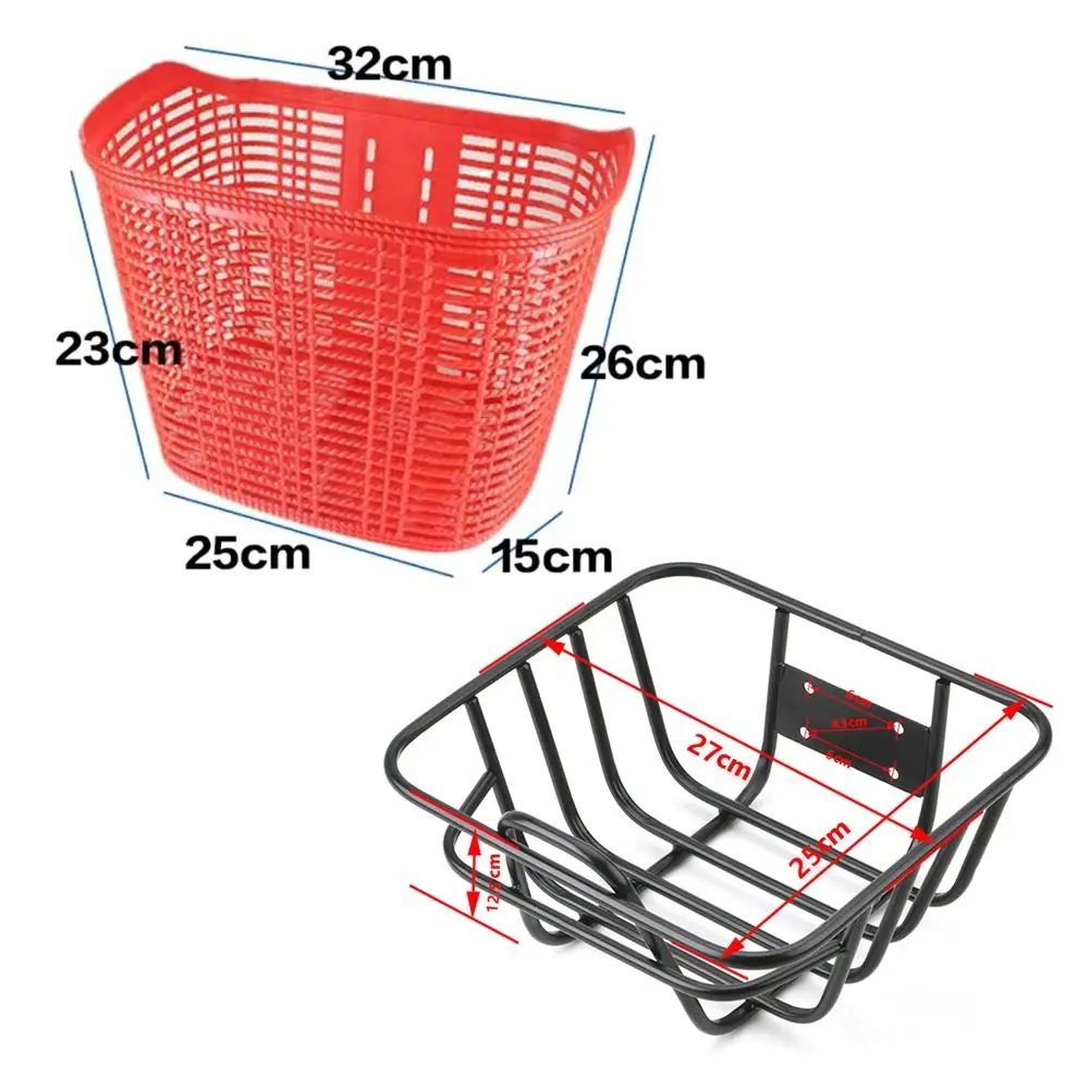 Brand new with high quality Material: Plastic&Iron Size:32*26cm(12.60*10.24in)/27*25*12.5cm(10.63*9.84*4.92in) Basket Color:Purple Red Green Yellow Blue Coffee Grey Pink Black Quantity:1pc Bicycle Basket Bike Basket Description: Fastens with straps to the cycle handlebar.
