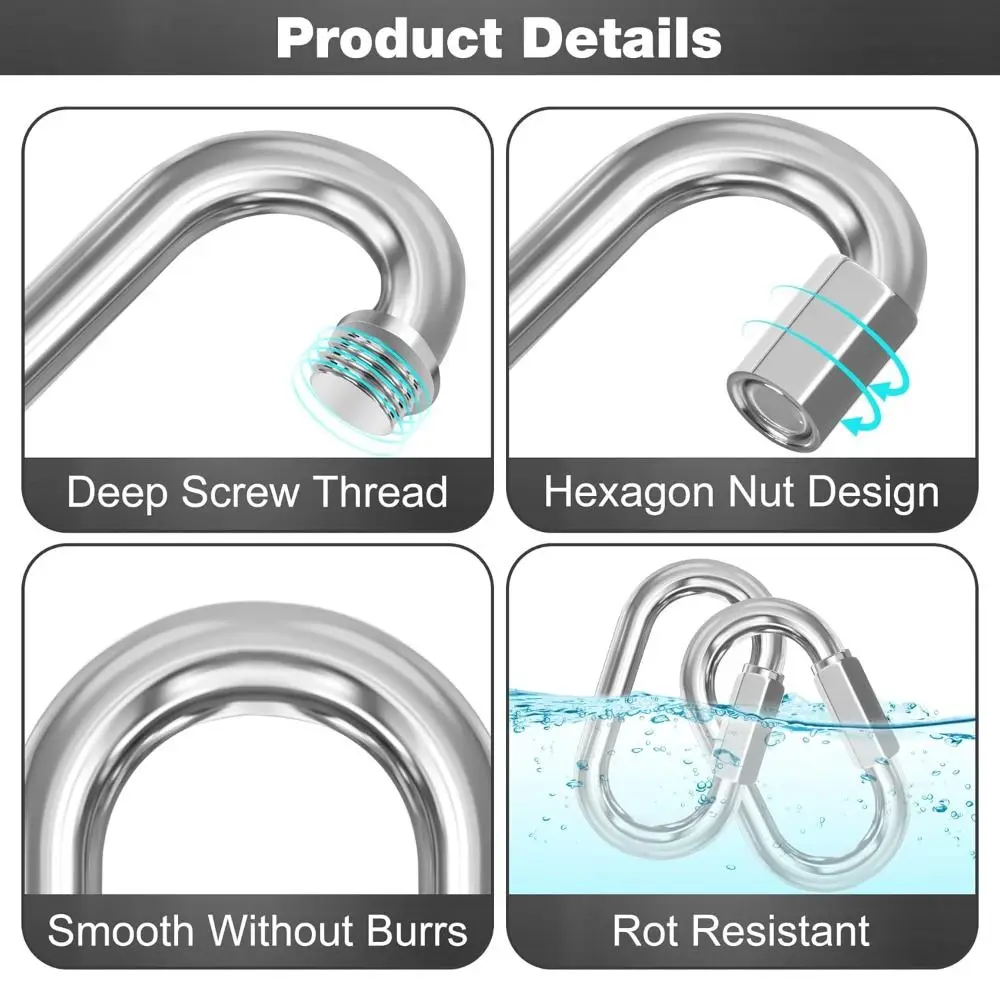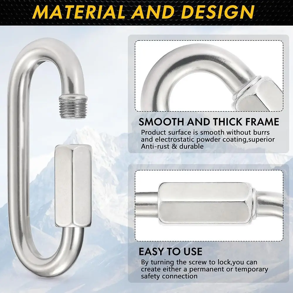 1. Acero inoxidable 304 duradero: el material del mosquetón es impermeable, resistente al óxido y a la corrosión, lo cual es muy adecuado para actividades al aire libre como columpio, hamaca, conexión de cable y cuerda.