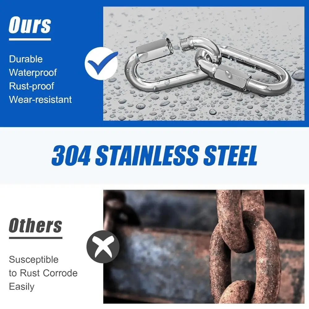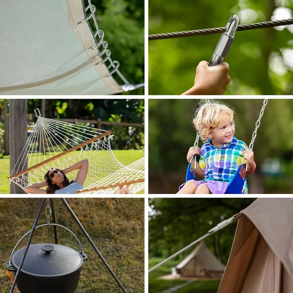 1.Durable 304 Stainless Steel:The material of carabiner is waterproof, rust-proof and corrosion-resistant, which is very suitable for outdoor activities such as swing, hammock, cable and rope connection.