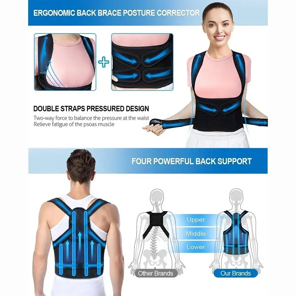 6. Improves Balance. The posture brace helps to eliminate back, shoulder, neck pain and lumbar pain, sprains and muscle spasms, improves balance and flexibility, and prevent further damage.