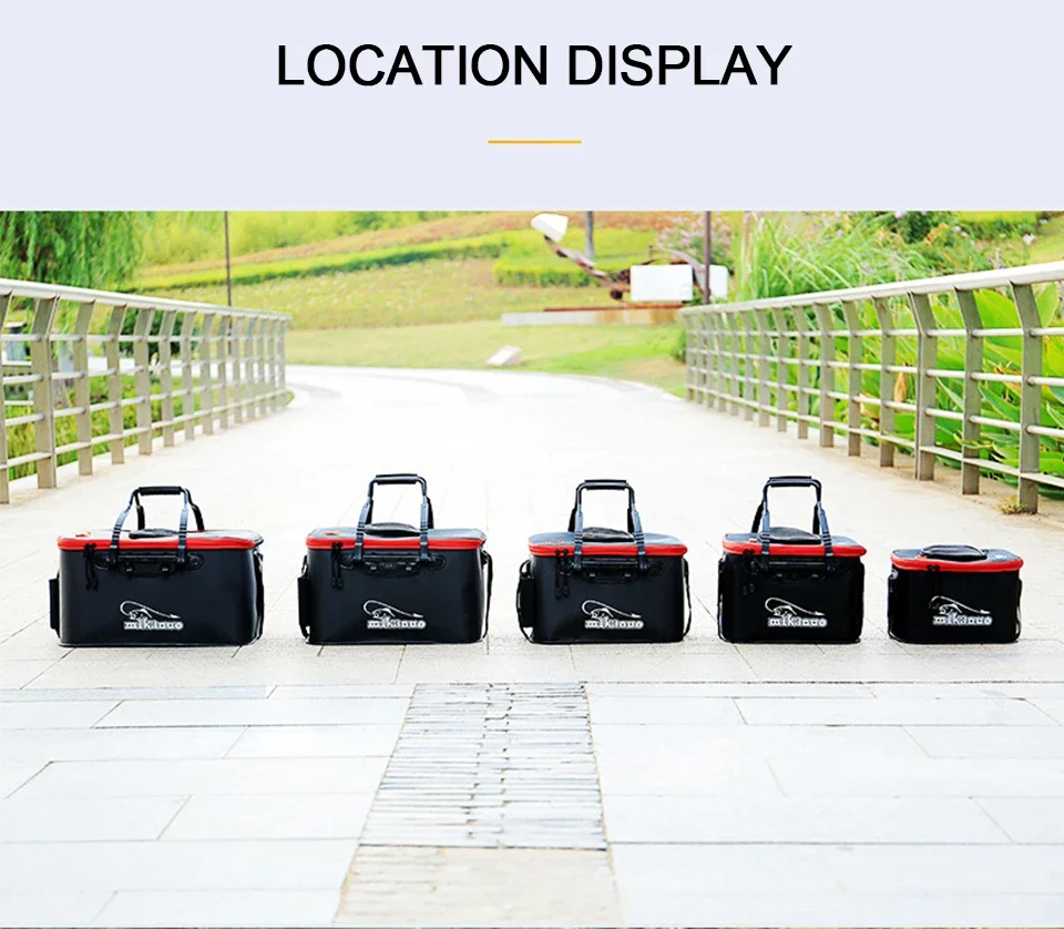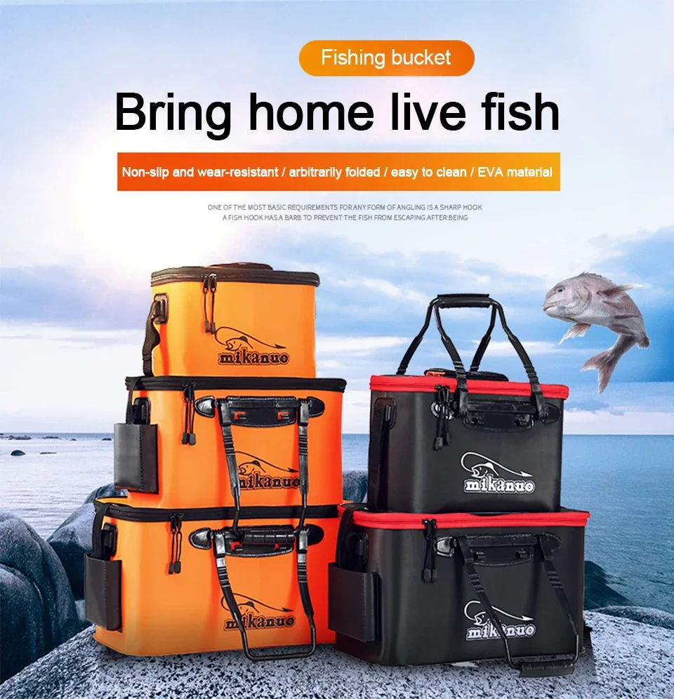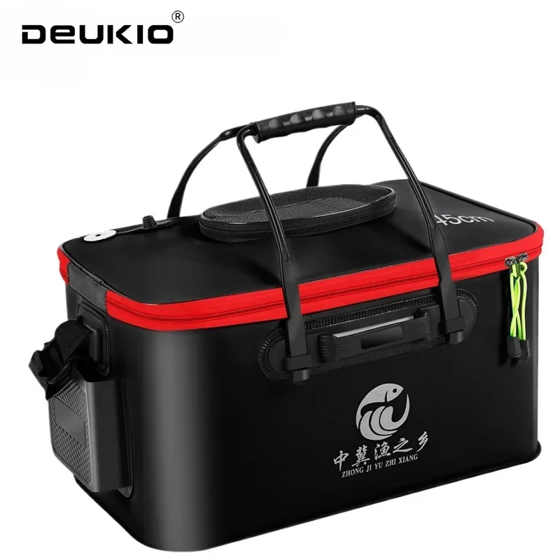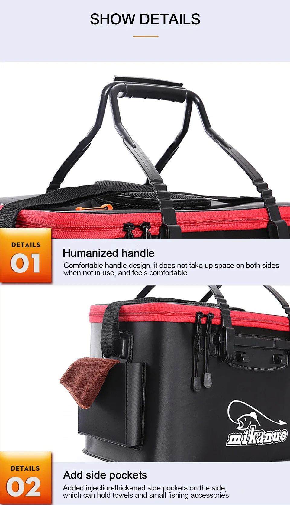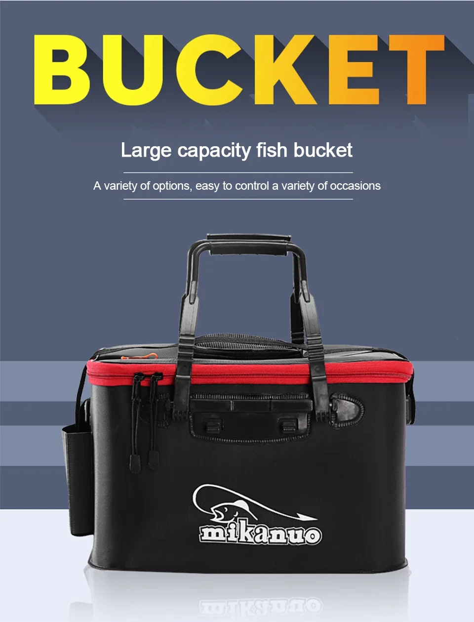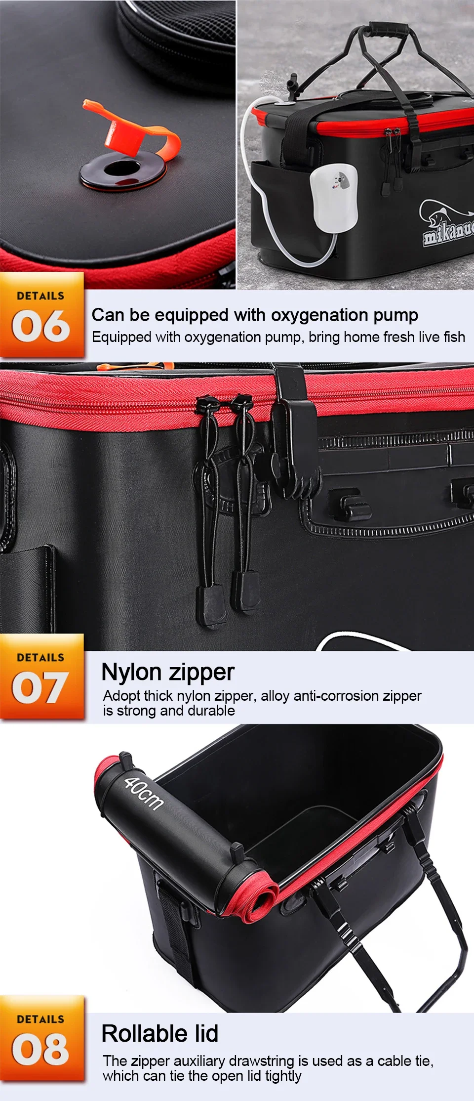 Cubo de pesca EVA Asas de transporte plegables Caja de peces vivos plegable con bolsillo lateral y cremallera para viajes Camping