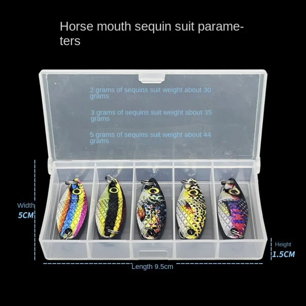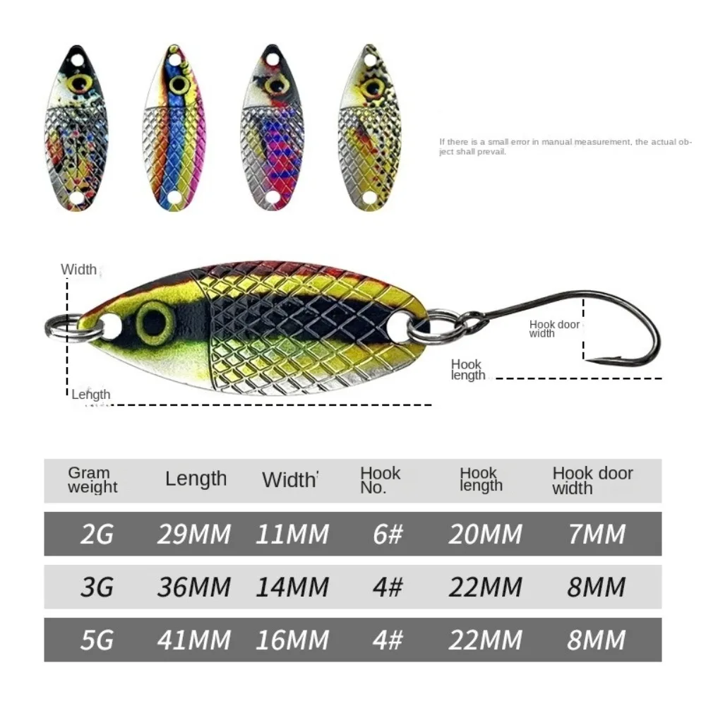 5pcs 2g/3g/5g Fishing Tackle Bait Fishing Metal Spoon hook Lure Bait For Trout Bass Spoons Small Hard Sequin Spinner Spoon Weight :2g/3g/5g approximate Length :29mm,36mm,41mm Type:SINKING Fishing lures for fishing lovers. Wonderful fishing tool for fishing lovers. Excellent buoyancy and sensitivity. Packing includes : 5pcs Fishing Lure