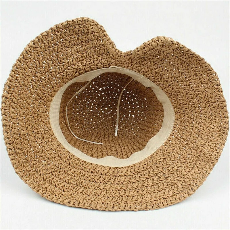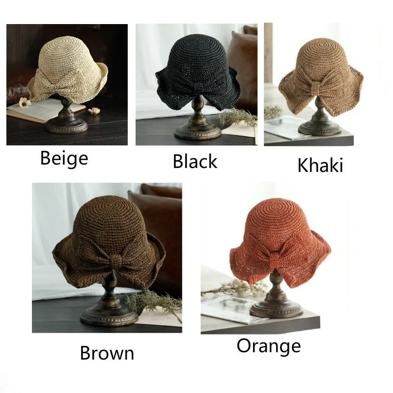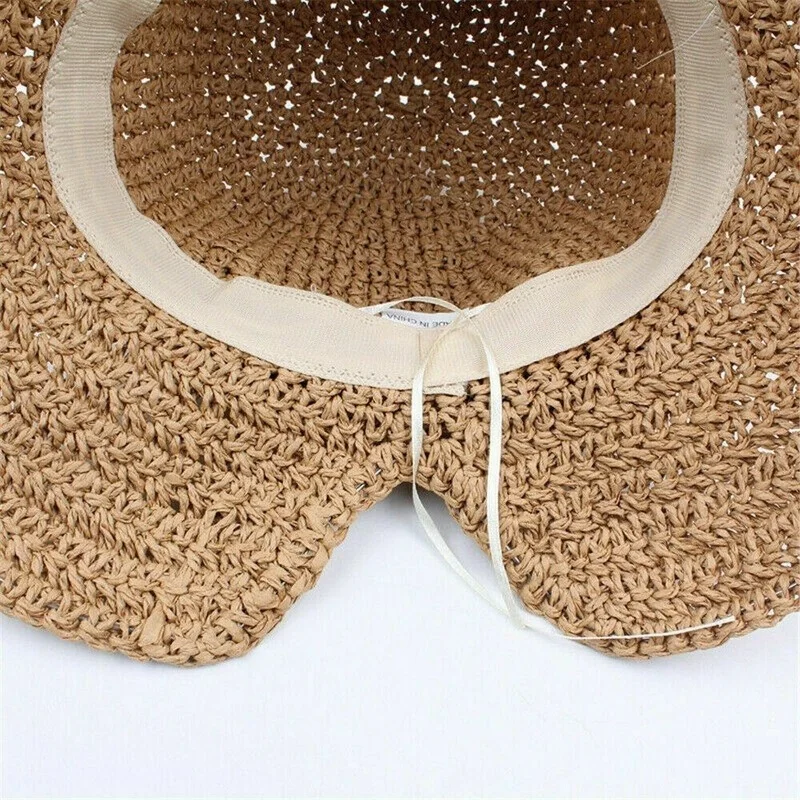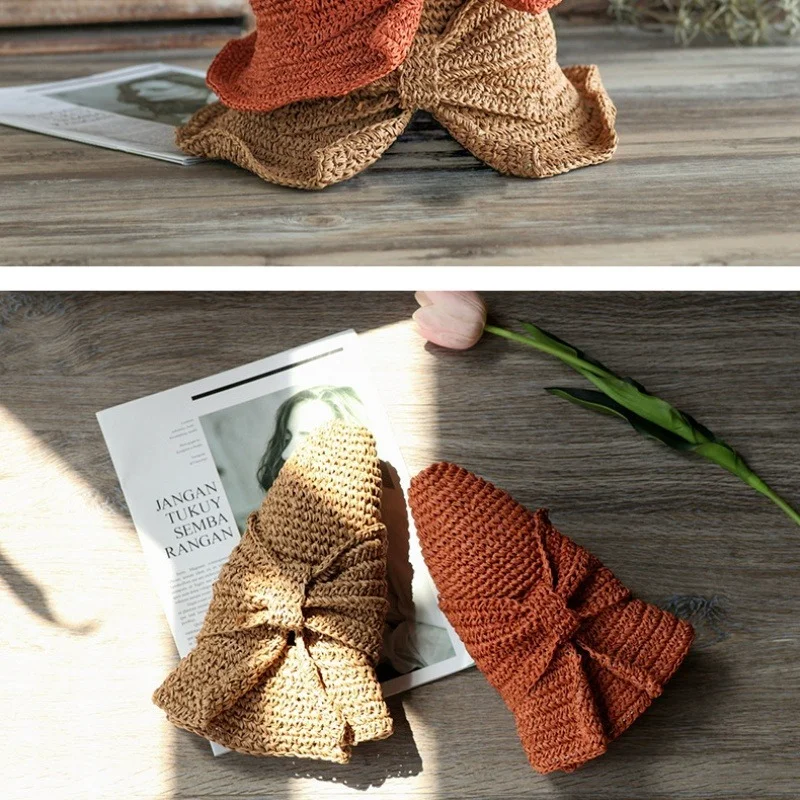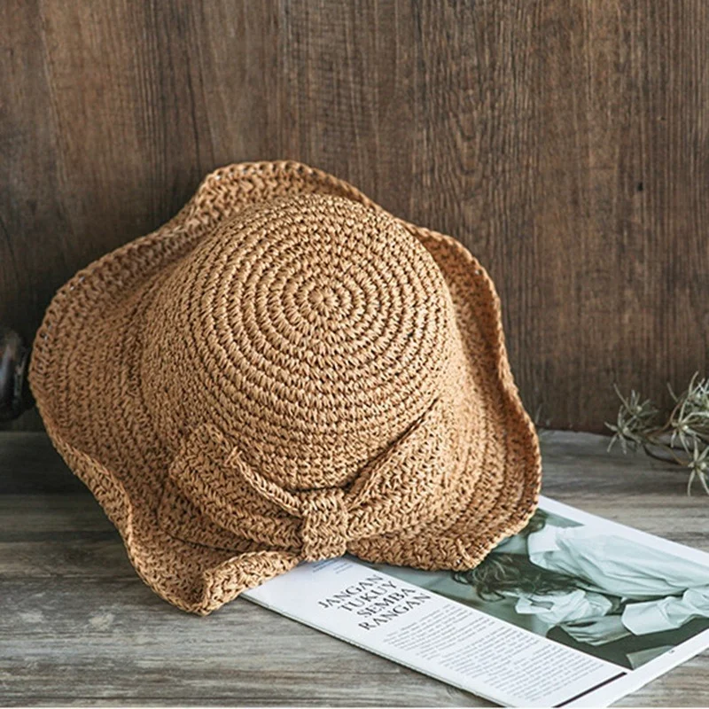 Nuevo sombrero de paja femenino con lazo de ganchillo, gorro de lavabo de verano, sombrero plegable para el sol y la playa, ala ancha, sombreros de playa plegables de princesa para niños
