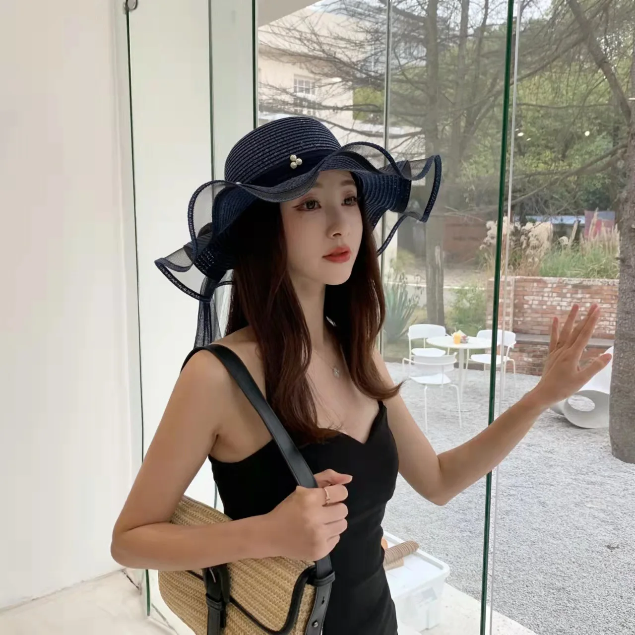 Nuevo sombrero plegable de ala ancha para el sol con perlas de paja para niña, sombrero ondulado para la playa, sombrero de viaje con protección UV, sombrero de playa para mujer, regalo de cumpleaños