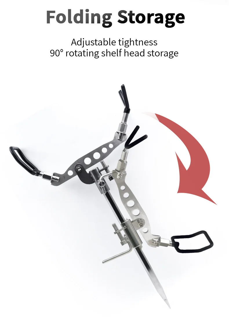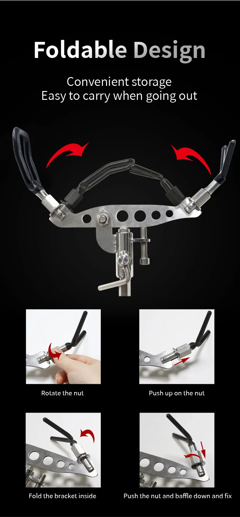1.Diseño plegable, fácil de almacenar, la cabeza del estante se puede girar 90° ajustando la elasticidad.
